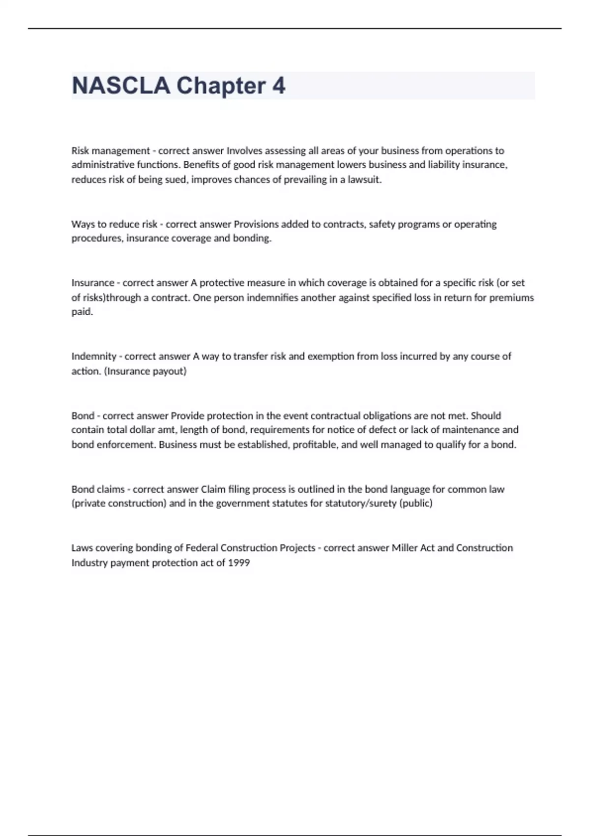 NASCLA Chapter 4Risk management - correct answer Involves assessing all areas of your business from operations to administrative functions. Benefits of good risk management lowers business and liability insurance, reduces risk of being sued, improves chances of prevailing in a lawsuit. Ways to reduce risk - correct answer Provisions added to contracts, safety programs or operating procedures, insurance coverage and bonding. Insurance - correct answer A protective measure in which coverage is obtained for a specific risk (or set of risks)through a contract. One person indemnifies another against specified loss in return for premiums paid. Indemnity - correct answer A way to transfer risk and exemption from loss incurred by any course of action. (Insurance payout) Bond - correct answer Provide protection in the event contractual obligations are not met. Should contain total dollar amt, length of bond, requirements for notice of defect or lack of maintenance and bond enforcement. Business must be established, profitable, and well managed to qualify for a bond. Bond claims - correct answer Claim filing process is outlined in the bond language for common law (private construction) and in the government statutes for statutory/surety (public) Laws covering bonding of Federal Construction Projects - correct answer Miller Act and Construction Industry payment protection act of 1999