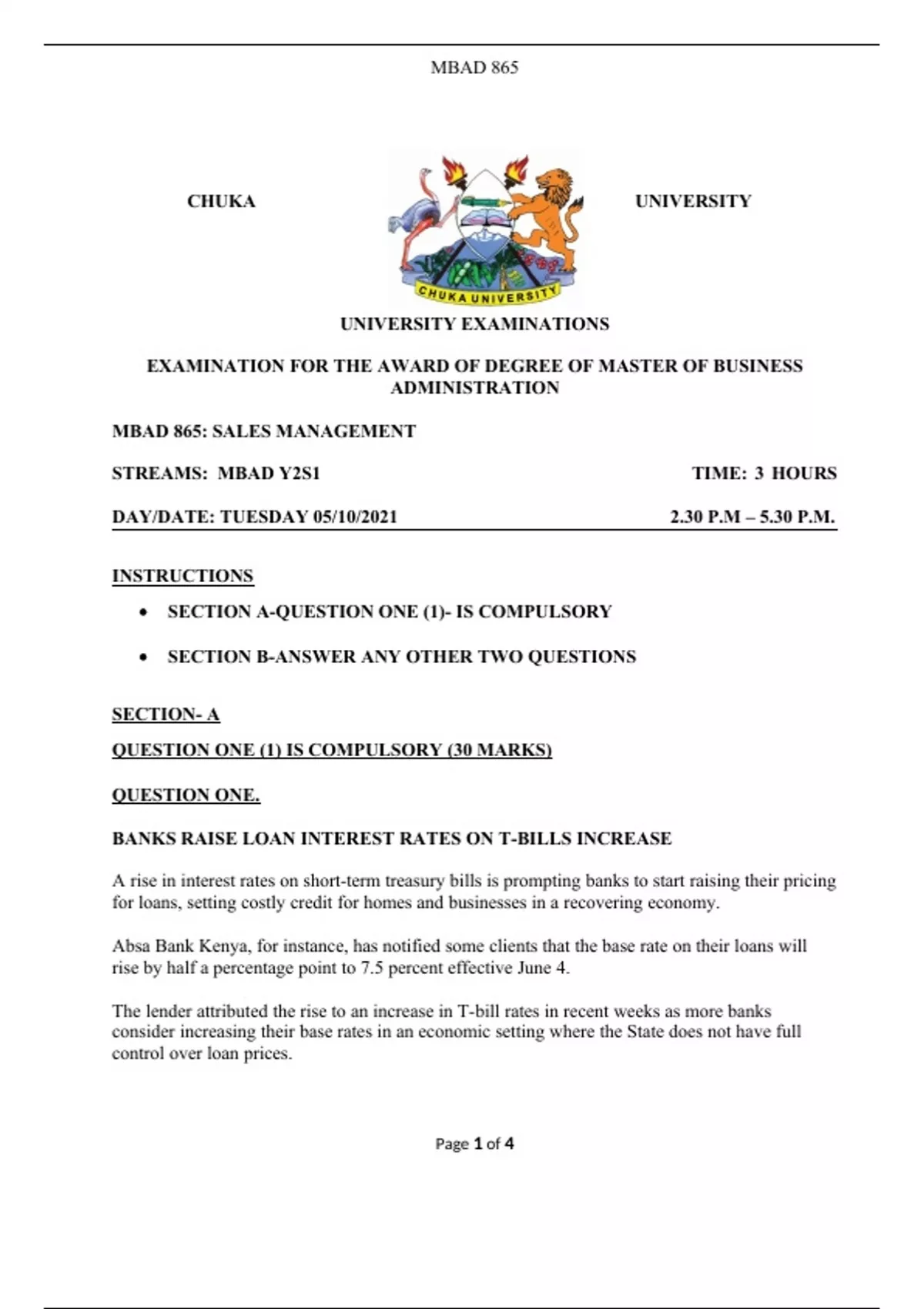 EXAMINATION FOR THE AWARD OF DEGREE OF MASTER OF BUSINESS