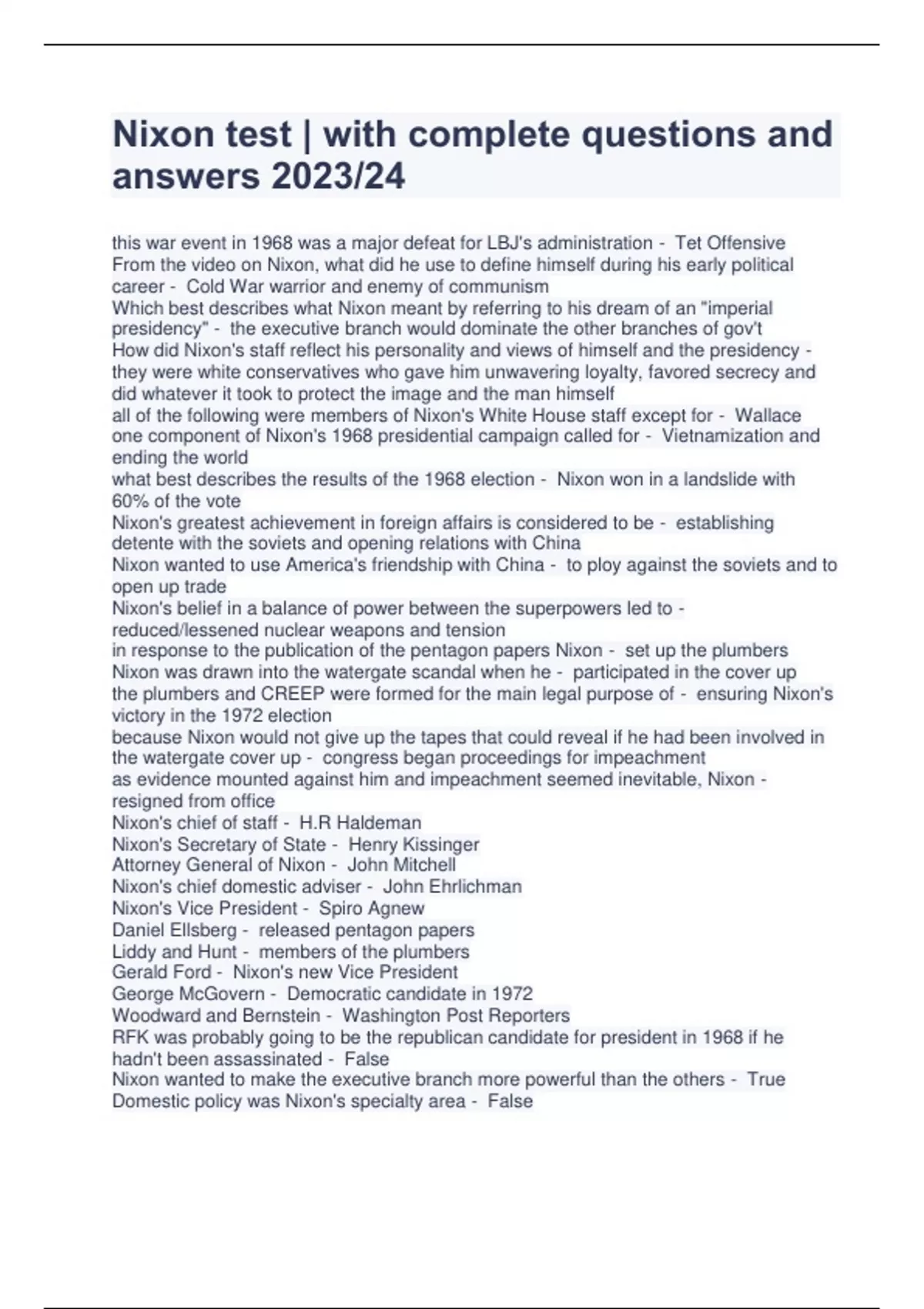 Nixon test | with complete questions and answers 2023/24 this war event in 1968 was a major defeat for LBJ's administration - Tet Offensive From the video on Nixon, what did he use to define himself during his early political career - Cold War warrior and enemy of communism Which best describes what Nixon meant by referring to his dream of an "imperial presidency" - the executive branch would dominate the other branches of gov't How did Nixon's staff reflect his personality and views of himself and the presidency - they were white conservatives who gave him unwavering loyalty, favored secrecy and did whatever it took to protect the image and the man himself all of the following were members of Nixon's White House staff except for - Wallace one component of Nixon's 1968 presidential campaign called for - Vietnamization and ending the world