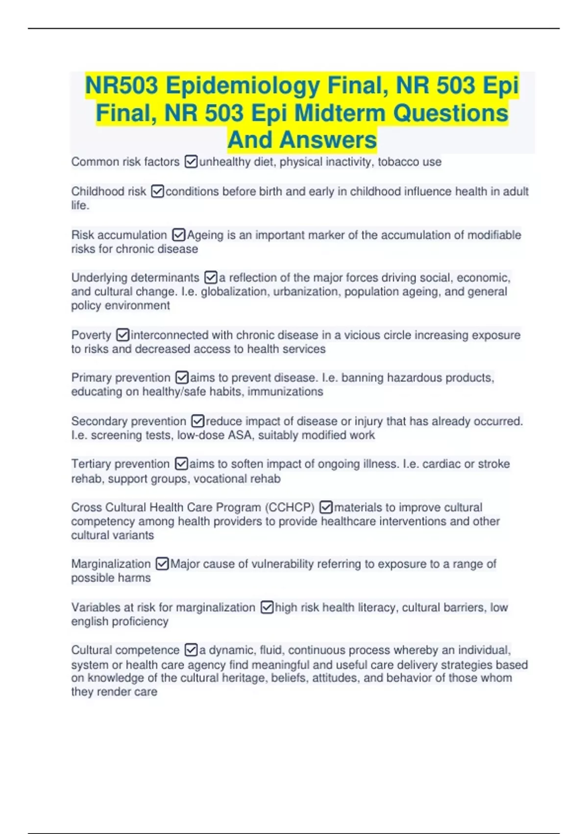 NR503 Epidemiology Final, NR 503 Epi Final, NR 503 Epi Midterm Questions And Answers NR503 Epidemiology Final, NR 503 Epi Final, NR 503 Epi Midterm Questions And Answers