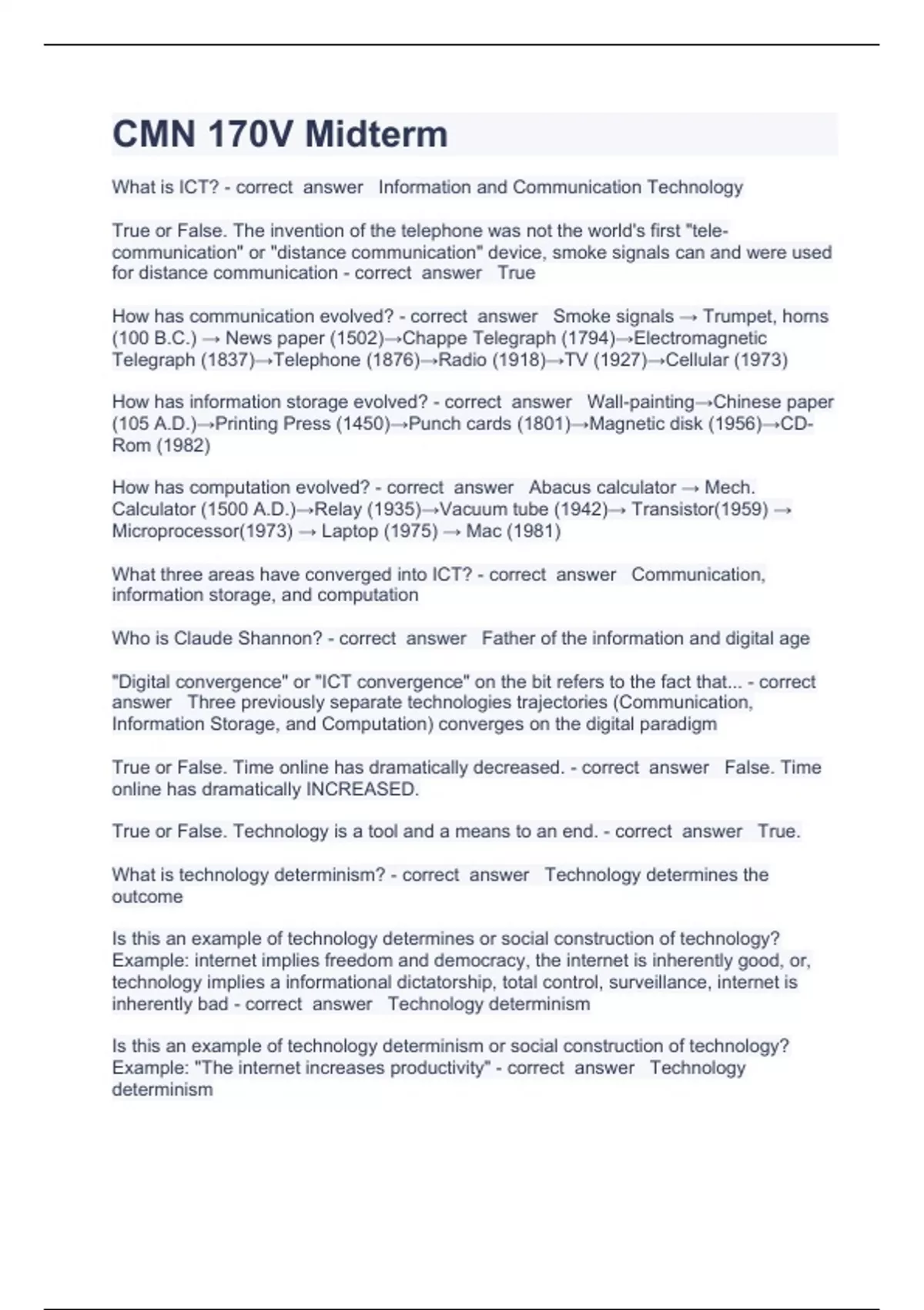 CMN 170V Midterm What is ICT? - correct answer Information and Communication Technology True or False. The invention of the telephone was not the world's first "tele-communication" or "distance communication" device, smoke signals can and were used for distance communication - correct answer True How has communication evolved? - correct answer Smoke signals → Trumpet, horns (100 B.C.) → News paper (1502)→Chappe Telegraph (1794)→Electromagnetic Telegraph (1837)→Telephone (1876)→Radio (1918)→TV (1927)→Cellular (1973) How has information storage evolved? - correct answer Wall-painting→Chinese paper (105 A.D.)→Printing Press (1450)→Punch cards (1801)→Magnetic disk (1956)→CD-Rom (1982) How has computation evolved? - correct answer Abacus calculator → Mech. Calculator (1500 Questions with complete solution 2023/2024
