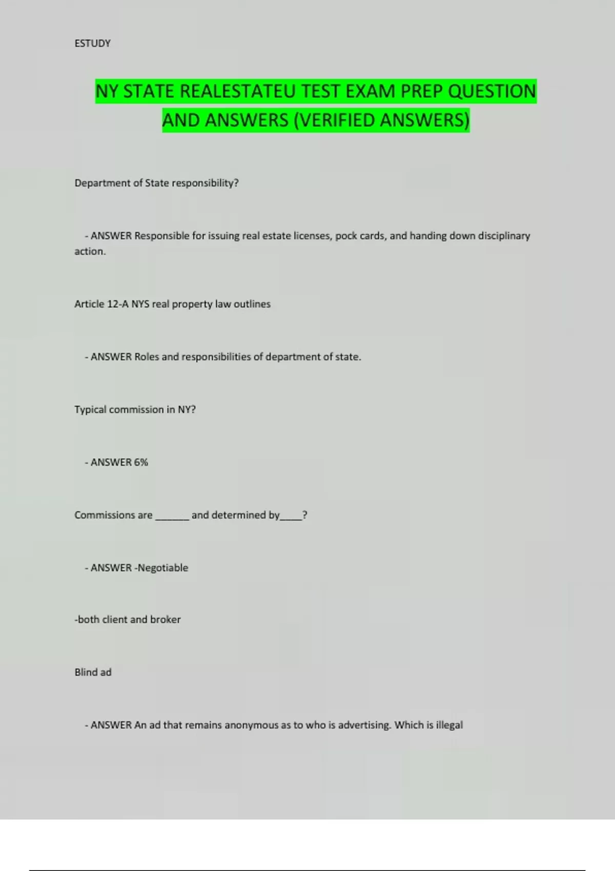 NY STATE REALESTATEU TEST EXAM PREP QUESTION AND ANSWERS (VERIFIED ANSWERS)