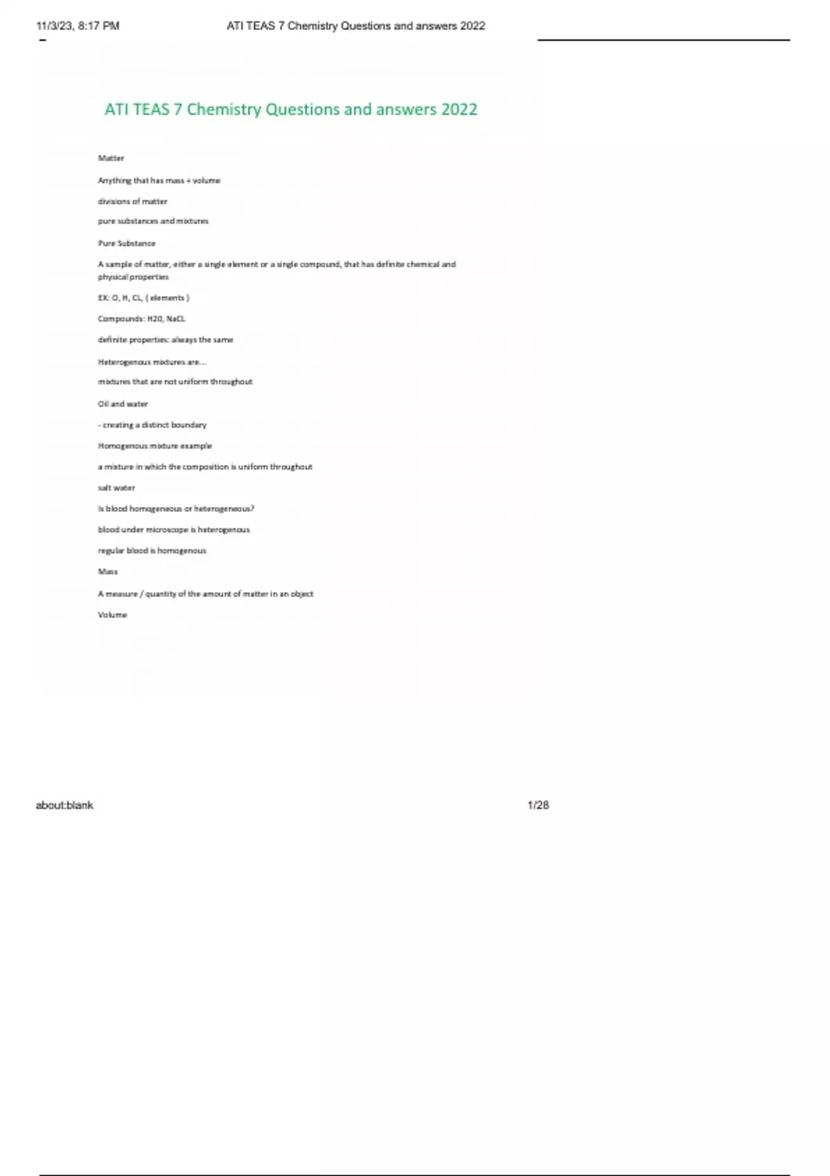 , 11/3/23, 8:17 PM ATI TEAS 7 Chemistry Questions and answers 2022