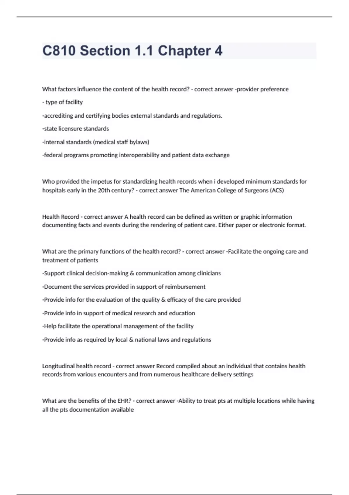 C810 Section 1.1 Chapter 4What factors influence the content of the health record? - correct answer -provider preference - type of facility -accrediting and certifying bodies external standards and regulations. -state licensure standards -internal standards (medical staff bylaws) -federal programs promoting interoperability and patient data exchange Who provided the impetus for standardizing health records when i developed minimum standards for hospitals early in the 20th century? - correct answer The American College of Surgeons (ACS) Health Record - correct answer A health record can be defined as written or graphic information documenting facts and events during the rendering of patient care. Either paper or electronic format. What are the primary functions of the health record? - correct answer -Facilitate the ongoing care and treatment of patients -Support clinical decision-making & communication among clinicians -Document the services provided in support of reimbursement -Provide info for the evaluation of the quality & efficacy of the care provided -Provide info in support of medical research and education -Help facilitate the operational management of the facility -Provide info as required by local & national laws and regulations Longitudinal health record - correct answer Record compiled about an individual that contains health records from various encounters and from numerous healthcare delivery settings What are the benefits of the EHR? - correct answer -Ability to treat pts at multiple locations while having all the pts documentation available -simultaneous viewing of patient documentation -ability to document remotely -benefits related to aggregating data, reimbursement, and research What are the challenges of the EHR? - correct answer -privacy and security -data integrity -system downtime -interoperability -provider acceptance and training -patient education What are 3 ways patient health record data can be used aside from direct patient care? - correct answer 1. to determine if a particular clinical service is profitable or not 2. can be used to review what types of conditions are most common in the emergency department 3. can assist with looking for trends in patients who are readmitted t the hospital 4. can be used to educate providers of the effectiveness of particular treatments What two broad categories can all health records be classified into? - correct answer 1. administrative and demographic data 2. clinical data What kinds of demographic data is included in the patient's chart? - correct answer -Patient's name -Patient's phone number -Patient's Address -Patient's date of birth -Patient's SSN -Patient's next of kin Unique identifier - correct answer A combination of numbers or alphanumeric characters assigned to a particular patient