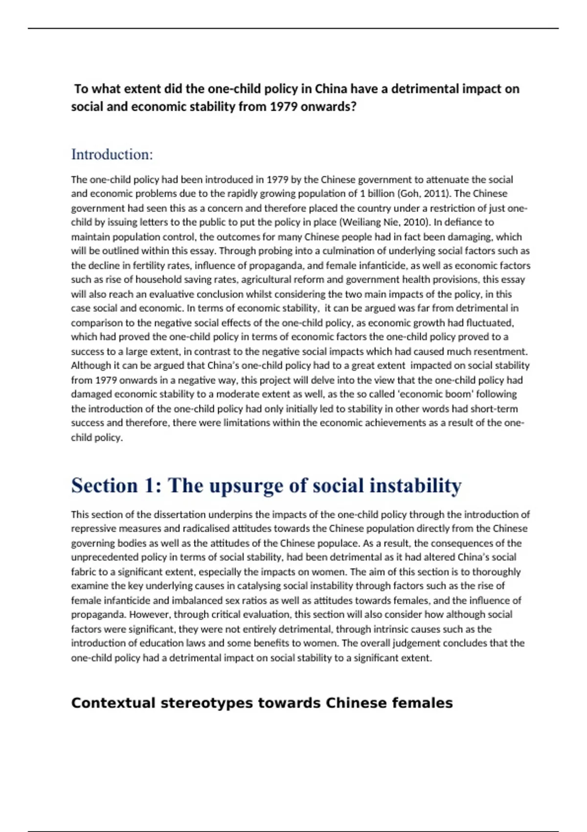 Although it can be argued that China’s one-child policy had to a great extent impacted on social stability
