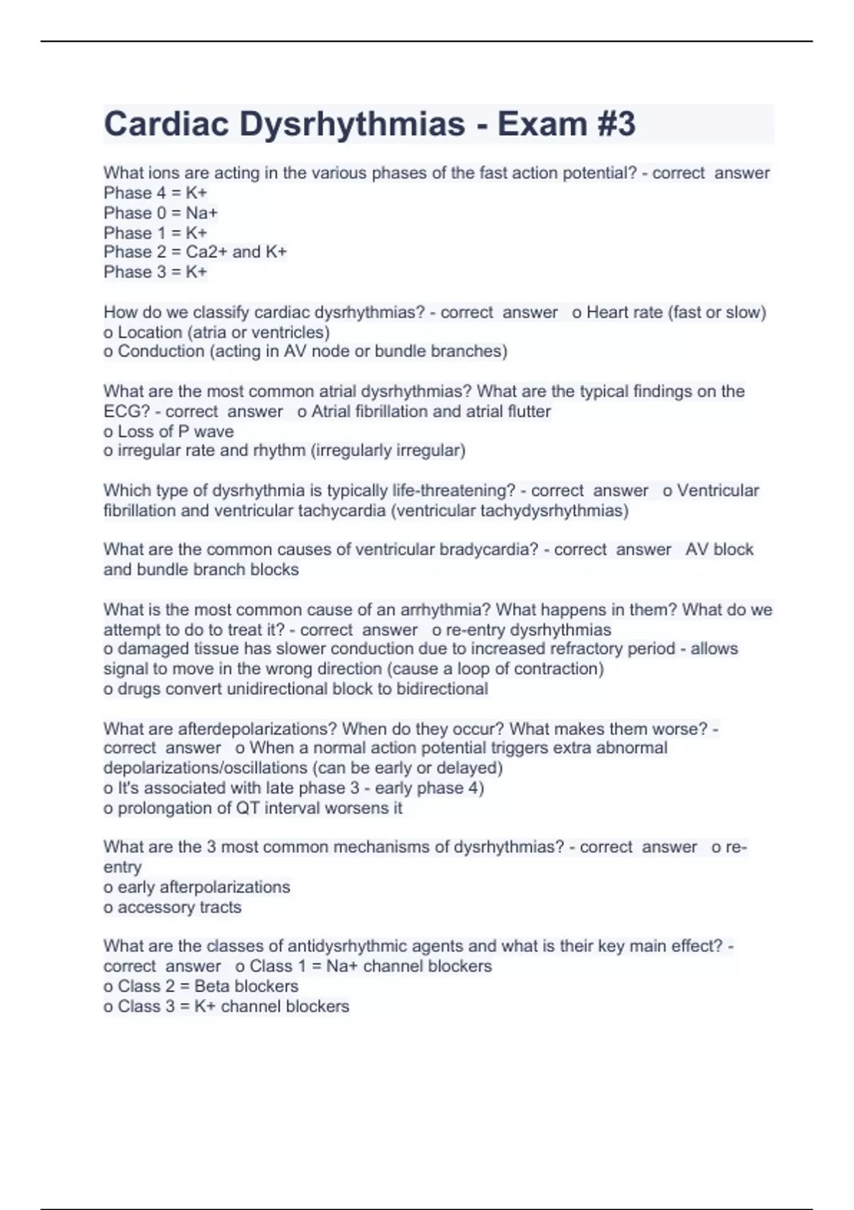 Cardiac DysrhythmWhat ions are acting in the various phases of the fast action potential? - correct answer Phase 4 = K+ Phase 0 = Na+ Phase 1 = K+ Phase 2 = Ca2+ and K+ Phase 3 = K+ How do we classify cardiac dysrhythmias? - correct answer o Heart rate (fast or slow) o Location (atria or ventricles) o Conduction (acting in AV node or bundle branches) What are the most common atrial dysrhythmias? What are the typical findings on the ECG? - correct answer o Atrial fibrillation and atrial flutter o Loss of P wave o irregular rate and rhythm (irregularly irregular) Which type of dysrhythmia is typically life-threatening? - correct answer o Ventricular fibrillation and ventricular tachycardia (ventricular tachydysrhythmias) What are the common causes of ventricular bradycardia? - correct answer AV block and bundle branch blocks What is the most common cause of an arrhythmia? What happens in them? What do we attempt to do to treat it? - correct answer o re-entry dysrhythmias o damaged tissue has slower conduction due to increased refractory period - allows signal to move in the wrong direction (cause a loop of contraction) o drugs convert unidirectional block to bidirectional What are afterdepolariz ias Question and answers rated A+ 2023/2024