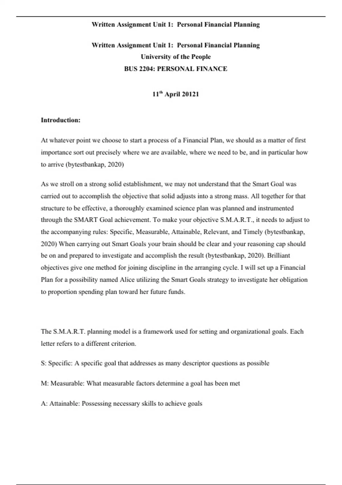 Plan for a possibility named Alice utilizing the Smart Goals strategy to investigate her obligation