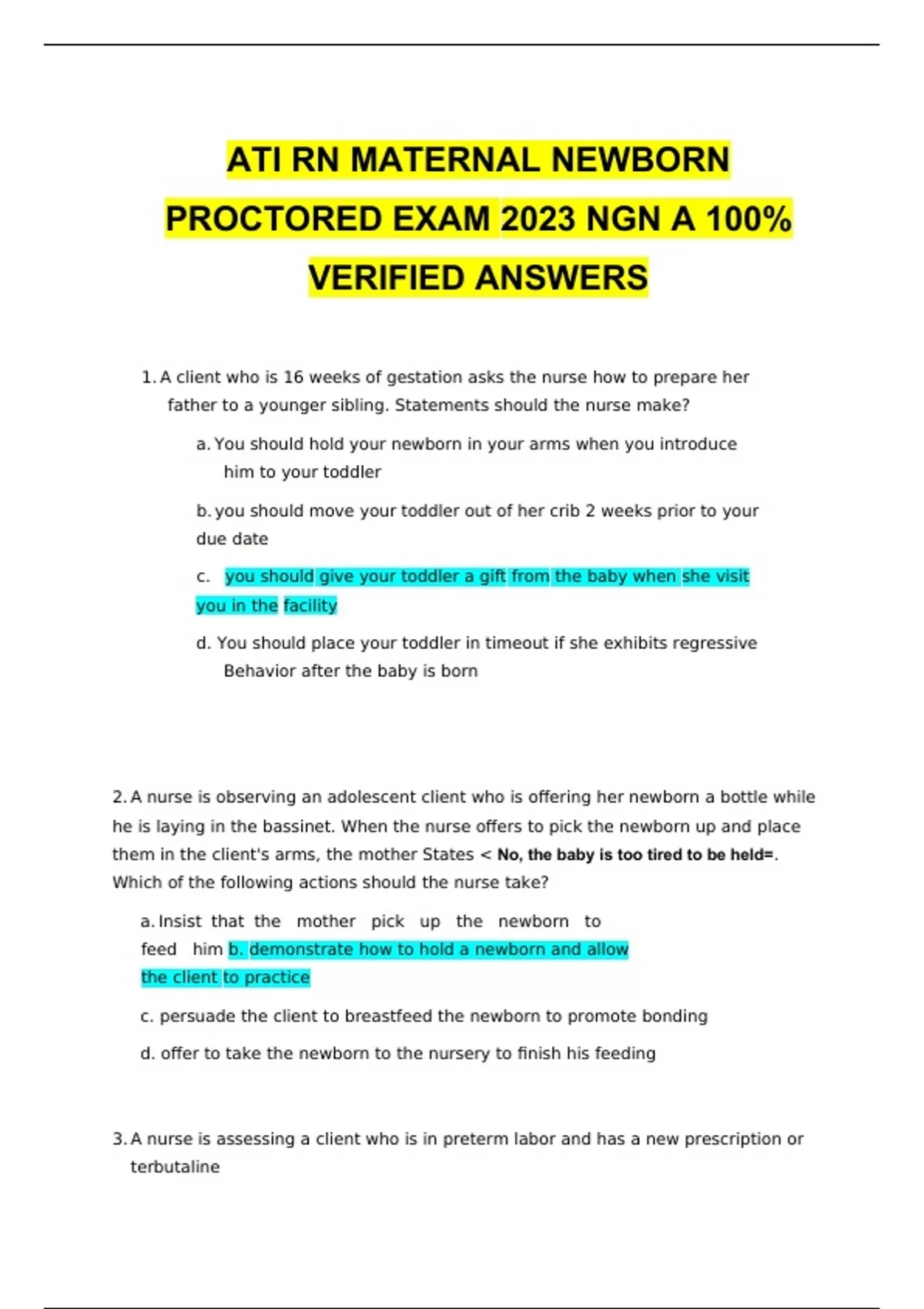 ATI RN MATERNAL NEWBORN PROCTORED EXAM 2023 NGN A 100% VERIFIED ANSWERS