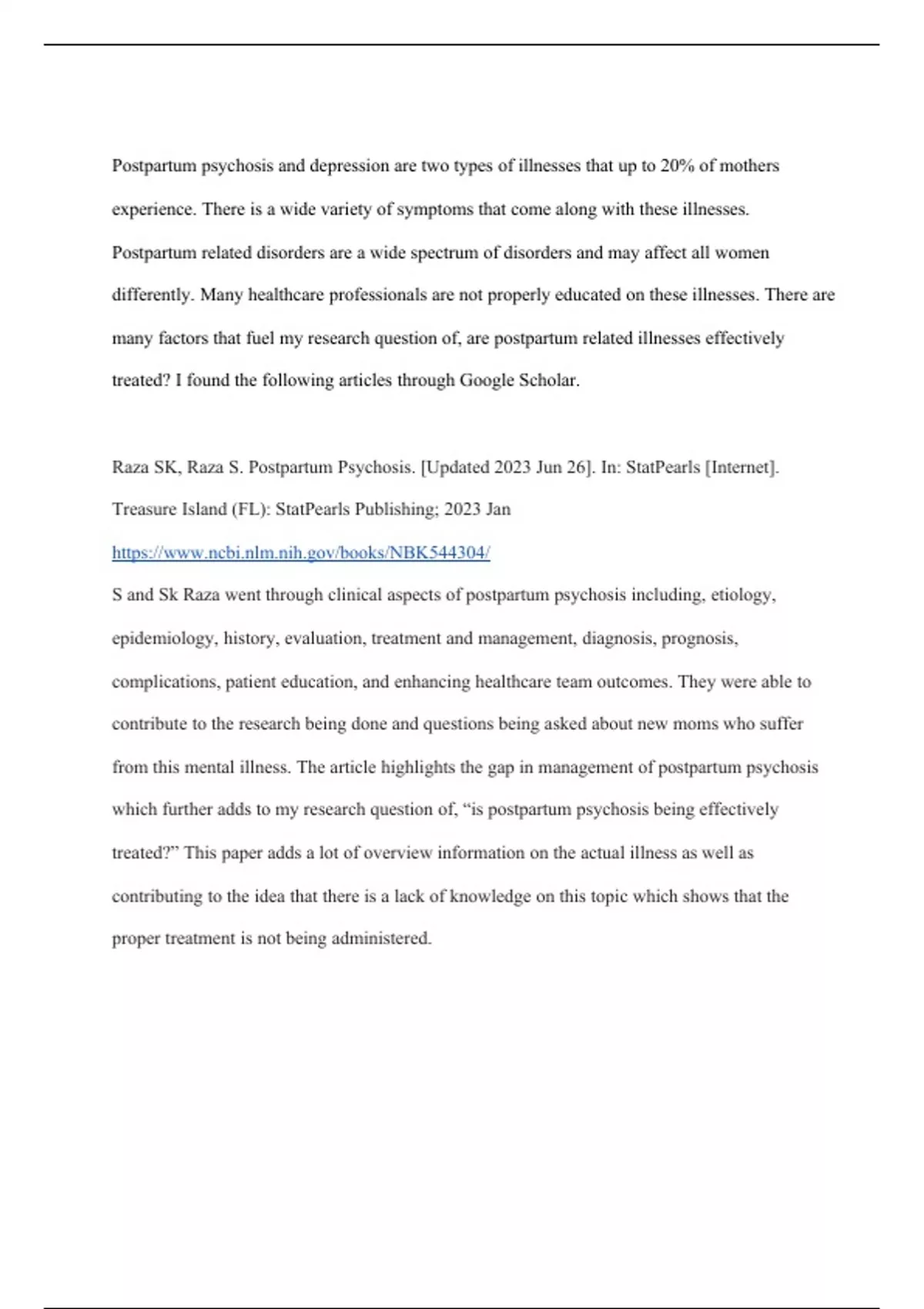 Annotated bibliography on postpartum related illnesses. Provides sources that discuss the different illnesses as well as common treatment routes. Show real data that express the need for more research and awareness on these disorders.