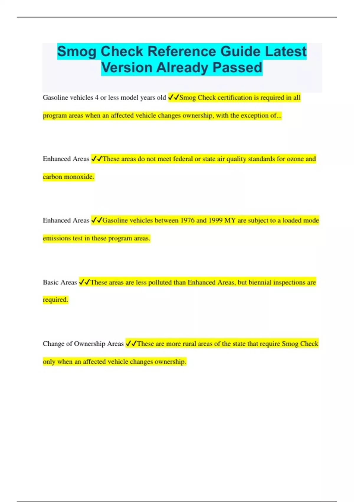 Smog Check Reference Guide Latest Version Already Passed Gasoline vehicles 4 or less model years old Smog Check certification is required in all program areas when an affected vehicle changes ownership, with the exception of... Enhanced Areas These areas do not meet federal or state air quality standards for ozone and carbon monoxide. Enhanced Areas Gasoline vehicles between 1976 and 1999 MY are subject to a loaded mode emissions test in these program areas. Basic Areas These areas are less polluted than Enhanced Areas, but biennial inspections are required. Change of Ownership Areas These are more rural areas of the state that require Smog Check only when an affected vehicle changes ownership. Zip code based station locator Some counties are solely in one program area, while other counties may be in two or three program areas. Use this tool on the BAR website to determine your program area. Gasoline Affected vehicles include 1976 and newer vehicles powered solely or in combination by: Propane Affected vehicles include 1976 and newer vehicles powered solely or in combination by: Natural gas Affected vehicles include 1976 and newer vehicles powered solely or in combination by: Methanol Affected vehicles include 1976 and newer vehicles powered solely or in combination by: Ethanol Affected vehicles include 1976 and newer vehicles powered solely or in combination by: 1998 and newer Any vehicle powered solely or in combination by diesel is only affected by the Smog Check program if it is from a model year... 14,000 lbs and less Any vehicle powered solely or in combination by diesel is only affected by the Smog Check program if it has a GVWR of Exempted until further notice Vehicles powered by CNG, LNG, or LPG with a GVWR of 14,001 or more are... Affected What is the status of a 1999 diesel vehicle under 14,000 GVWR? Exempted What is the status of a 2001 diesel vehicle over 14,001 GVWR? Affected What is the status of a 2000 gasoline hybrid vehicle? Affected What is the status of a 2008 gasoline vehicle over 14,001 GVWR? Exempted What is the status of a gasoline vehicle 1975 or older? Exempt from change of ownership inspection and biennial inspection What is the status of a gasoline vehicle 4 or less model years old? Affected What is the status of a diesel vehicle 4 or less model years old? Exempt from biennial inspection What is the status of a gasoline vehicle 6 or less model years old? Exempted What is the status of a diesel vehicle 1997 or older? Exempted What is the status of a diesel vehicle with a GVWR of 14,001 lbs or more? Exempted What is the status of a vehicle powered solely by