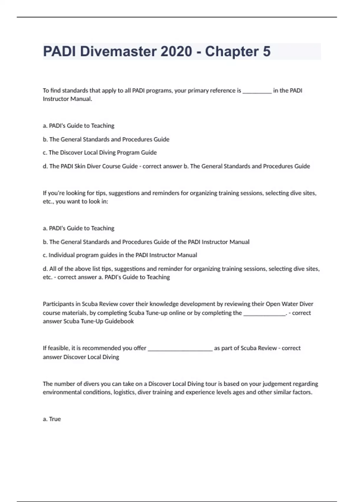 PADI Divemaster 2020 - Chapter 5To find standards that apply to all PADI programs, your primary reference is _________ in the PADI Instructor Manual. a. PADI's Guide to Teaching b. The General Standards and Procedures Guide c. The Discover Local Diving Program Guide d. The PADI Skin Diver Course Guide - correct answer b. The General Standards and Procedures Guide If you're looking for tips, suggestions and reminders for organizing training sessions, selecting dive sites, etc., you want to look in: a. PADI's Guide to Teaching b. The General Standards and Procedures Guide of the PADI Instructor Manual c. Individual program guides in the PADI Instructor Manual d. All of the above list tips, suggestions and reminder for organizing training sessions, selecting dive sites, etc. - correct answer a. PADI's Guide to Teaching Participants in Scuba Review cover their knowledge development by reviewing their Open Water Diver course materials, by completing Scuba Tune-up online or by completing the _____________. - correct answer Scuba Tune-Up Guidebook If feasible, it is recommended you offer ____________________ as part of Scuba Review - correct answer Discover Local Diving The number of divers you can take on a Discover Local Diving tour is based on your judgement regarding environmental conditions, logistics, diver training and experience levels ages and other similar factors. a. True b. False - correct answer True A couple tells you that they want to explore the underwater world, but that they don't want to deal with scuba gear. They have a 9 year old daughter whom they want to participate with them. You would probably recommend a. Discover Scuba Diving b. Discover Local Diving c. The PADI Skin Diver Course d. Scuba Review - correct answer c. The PADI Skin Diver Course After which of the follow would you complete the PIC process for successful participants? a. Discover Scuba Diving b. Discover Local Diving c. The PADI Skin Diver Course d. Scuba Review - correct answer c. The PADI Skin Diver Course As a PADI Divemaster who has completed the DSD Internship, you can take Discover Scuba Diving participants on their first open water dive. a. True b. False - correct answer False As a PADI Divemaster who is assisting an instructor with a Discover Scuba Diving experience or as a DSD Leader, you must position yourself so you can make immediate contact or render immediate assistance for participants at all time, and only look away from them briefly as needed to lead the dive. a. True b. False - correct answer a. True