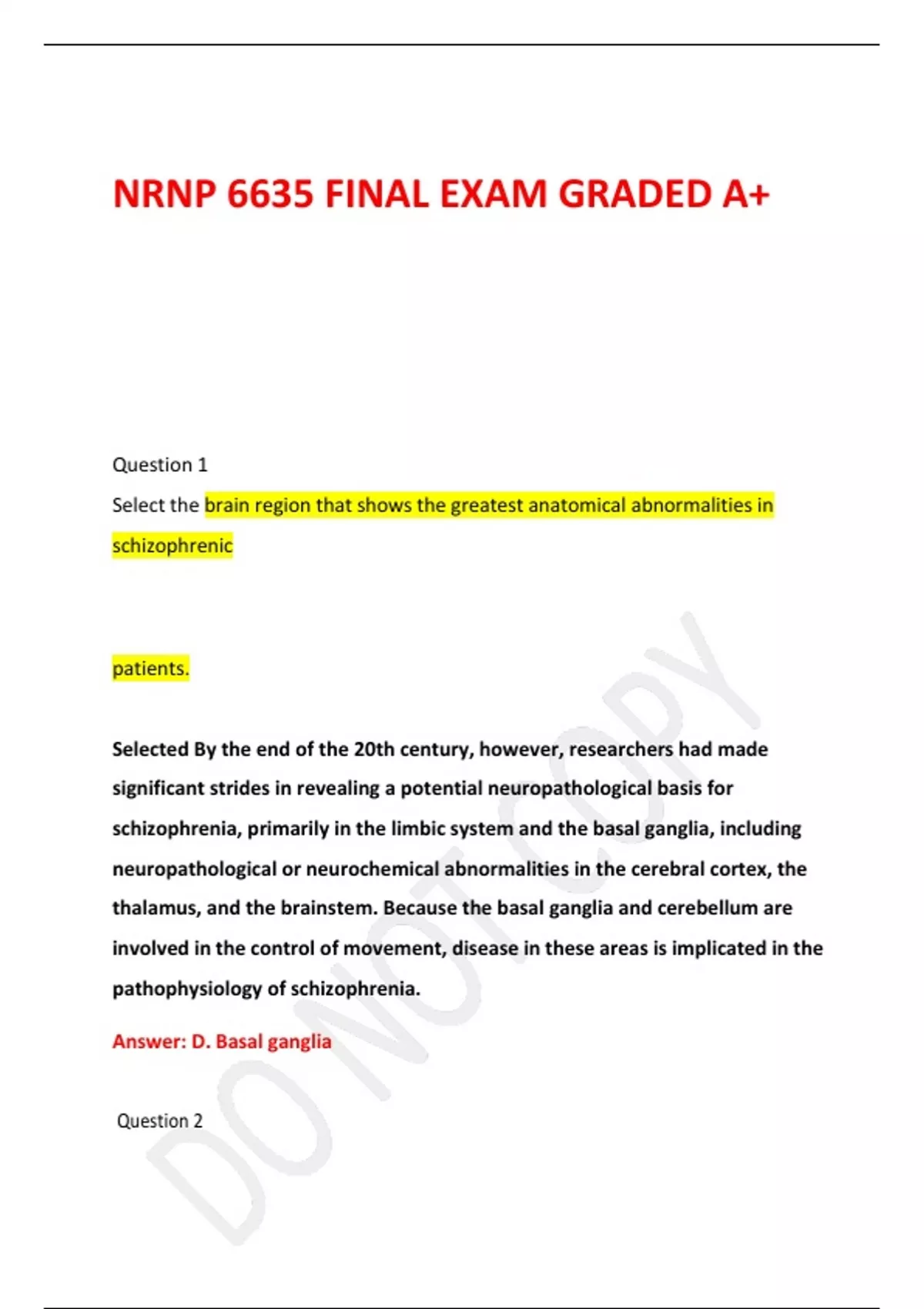 NRNP 6635 FINAL EXAM GRADED A+ Question 1 Select the brain region that shows the greatest anatomical abnormalities in schizophrenic patients. Selected By the end of the 20th century, however, researchers had made significant strides in revealing a potential neuropathological basis for schizophrenia, primarily in the limbic system and the basal ganglia, including neuropathological or neurochemical abnormalities in the cerebral cortex, the thalamus, and the brainstem. Because the basal ganglia and cerebellum are involved in the control of movement, disease in these areas is implicated in the pathophysiology of schizophrenia. Answer: D. Basal ganglia Question 2 Select the psychiatric theorist who proposed that all pleasurable impulses and activities are sexual Select C. e d Fr Answe e Select the most frequent cause of infant and childhood intellectual attributed to a specific gene. Question 4 Select the neurotransmitter that increases Select Answe d B. NRNP 6635 FINAL EXAM QUESTIONS AND ANSWERS BEST GRADED A + LATEST UPDATE 2022 WALDEN UNIVERSITY
