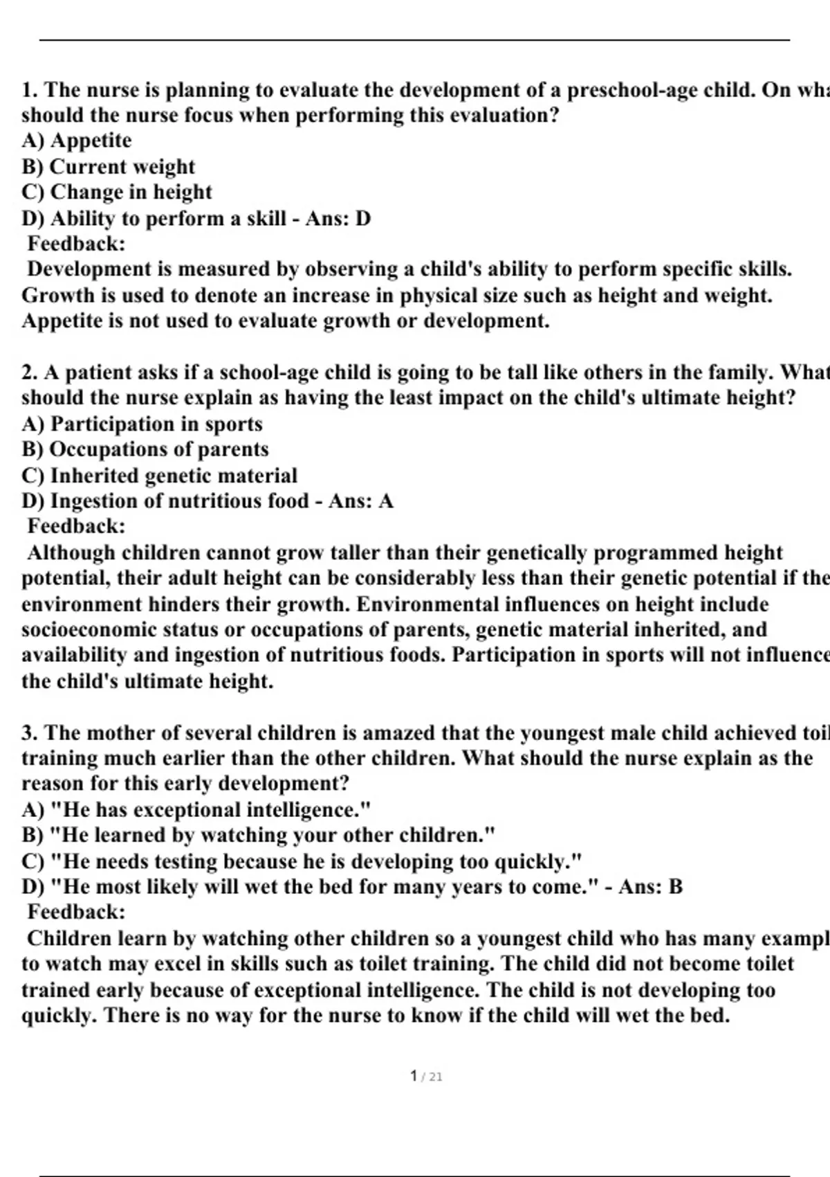 1. The nurse is planning to evaluate the development of a preschool-age child. On what should the nurse focus when performing this evaluation? A) Appetite B) Current weight C) Change in height D) Ability to perform a skill - Ans: D Feedback: Development is measured by observing a child's ability to perform specific skills. Growth is used to denote an increase in physical size such as height and weight. Appetite is not used to evaluate growth or development. 2. A patient asks if a school-age child is going to be tall like others in the family. What should the nurse explain as having the least impact on the child's ultimate height? A) Participation in sports B) Occupations of parents C) Inherited genetic material D) Ingestion of nutritious food - Ans: A Feedback: Although children cannot grow taller than their genetically programmed height potential, their adult height can be considerably less than their genetic potential if their environment hinders their growth. Environmental influences on height include socioeconomic status or occupations of parents, genetic material inherited, and availability and ingestion of nutritious foods. Participation in sports will not influence the child's ultimate height. 3. The mother of several children is amazed that the youngest male child achieved toilet training much earlier than the other children. What should the nurse explain as the reason for this early development? A) "He has exceptional intelligence." B) "He learned by watching your other children." C) "He needs testing because he is developing too quickly." D) "He most likely will wet the bed for many years to come." - Ans: B Feedback: Children learn by watching other children so a youngest child who has many examples to watch may excel in skills such as toilet training. The child did not become toilet trained early because of exceptional intelligence. The child is not developing too quickly. There is no way for the nurse to know if the child will wet the bed. 4. A patient is concerned that the new baby is going to have a weight problem growing up because other family members are obese. What should the nurse respond to this patient? A) Restrict all fatty foods up until age 5 years. B) Restrict fatty foods after the age of 10 years. C) Do not restrict fatty foods until the age of 2 years. D) Keep fat intake to less than 50% of total daily intake. - Ans: C Feedback: For children, fat intake does not need to be restricted for the first 2 years of life because fat is necessary for myelination of spinal nerves. After the age of 2 years, fat intake can be tailored to meet the guidelines of 30% total intake for both children and adults. The patient should not restrict all fatty foods up until the age of 5 years or after the age of 10 years. Fat intake after the age of 2 years should be limited to 30% of total caloric intake. 5. During a home visit, the nurse observes an 8-year-old child pick up toys and place them in the toy box. The child then looks to the mother who says, "Thank you for helping me." Which stage of Kohlberg's moral development is this child demonstrating? A) Individualism B) Maintenance of social order C) Punishment/obedience orientation D) Interpersonal relations of mutuality - Ans: D Feedback: In the stage of interpersonal relations of mutuality, the child will follow rules because of a need to be a "good" person in their own eyes and in the eyes of others. The mother's praise reinforces this behavior. In the punishment/obedience stage, the child does "right" to avoid punishment. In the individualism stage, the child will carry out actions to satisfy own needs rather than others. In the maintenance of social order stage, the child will follow rules of authority figures as well as parents in an effort to keep the "system" working. 6. Which activity should the nurse encourage a new mother to perform to foster the developmental tasks of a toddler according to Erikson's developmental stages? A) Feed the child lunch. B) Read the child a story every night. C) Allow the child to pull a talking duck toy. D) Have the child watch a puppet show on television. - Ans: C