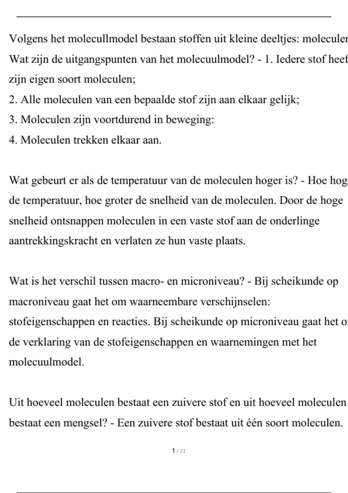 Volgens het molecullmodel bestaan stoffen uit kleine deeltjes: moleculen. Wat zijn de uitgangspunten van het molecuulmodel? - 1. Iedere stof heeft zijn eigen soort moleculen; 2. Alle moleculen van een bepaalde stof zijn aan elkaar gelijk; 3. Moleculen zijn voortdurend in beweging: 4. Moleculen trekken elkaar aan. Wat gebeurt er als de temperatuur van de moleculen hoger is? - Hoe hoger de temperatuur, hoe groter de snelheid van de moleculen. Door de hoge snelheid ontsnappen moleculen in een vaste stof aan de onderlinge aantrekkingskracht en verlaten ze hun vaste plaats. Wat is het verschil tussen macro- en microniveau? - Bij scheikunde op macroniveau gaat het om waarneembare verschijnselen: stofeigenschappen en reacties. Bij scheikunde op microniveau gaat het om de verklaring van de stofeigenschappen en waarnemingen met het molecuulmodel. Uit hoeveel moleculen bestaat een zuivere stof en uit hoeveel moleculen bestaat een mengsel? - Een zuivere stof bestaat uit één soort moleculen. Een mengsel bestaat uit twee of meer soorten moleculen. Het scheiden van een mengsel komt op microniveau neer op het sorteren van twee of meer soorten moleculen. Wat gebeurt er in chemische reacties op macroniveau? - Op macroniveau: bij een chemische reactie verdwijnen de beginstoffen en ontstaan de reactieproducten. Wat gebeurt er in chemische reacties op microniveau? - Op microniveau: bij een chemische reactie verdwijnen de moleculen van de beginstoffen en vormen zich de moleculen van de reactieproducten. Welke fases zijn er? - Achter de stof staat de fase: vast (s), vloeibaar (l), gas (g) of de toestandsaanduiding opgelost in water (aq). Waarvan hangt de fase van een stof af? - De fase hangt af van de temperatuur. T (K) = T (ºC) + 273 Wat gebeurt er bij een ontleding? - Bij een ontleding ontstaan uit één beginstof twee of meer reactieproducten.
