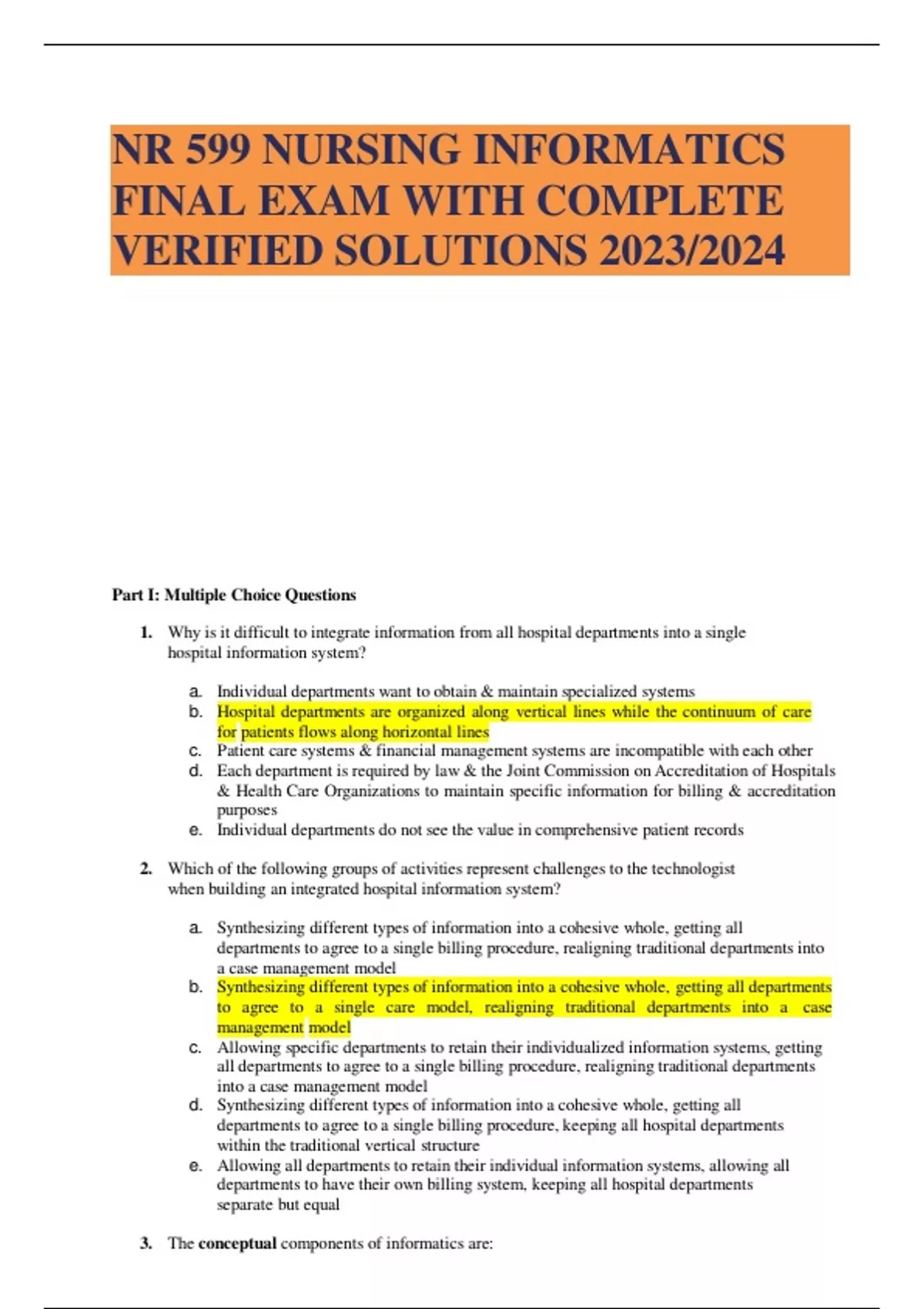 NR 599 NURSING INFORMATICS FINAL EXAM WITH COMPLETE VERIFIED SOLUTIONS 2023/2024