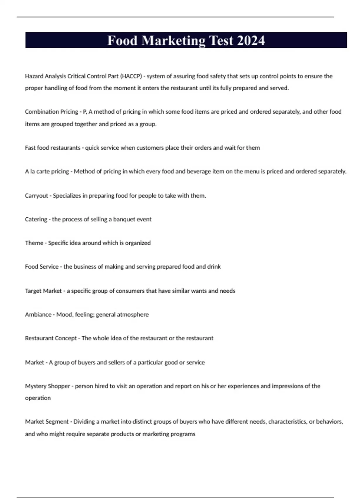 Food Marketing Test 2024 Hazard Analysis Critical Control Part (HACCP) - system of assuring food safety that sets up control points to ensure the proper handling of food from the moment it enters the restaurant until its fully prepared and served. Combination Pricing - P, A method of pricing in which some food items are priced and ordered separately, and other food items are grouped together and priced as a group. Fast food restaurants - quick service when customers place their orders and wait for them A la carte pricing - Method of pricing in which every food and beverage item on the menu is priced and ordered separately. Carryout - Specializes in preparing food for people to take with them. Catering - the process of selling a banquet event Theme - Specific idea around which is organized Food Service - the business of making and serving prepared food and drink Target Market - a specific group of consumers that have similar wants and needs Ambiance - Mood, feeling; general atmosphere Restaurant Concept - The whole idea of the restaurant or the restaurant Market - A group of buyers and sellers of a particular good or service Mystery Shopper - person hired to visit an operation and report on his or her experiences and impressions of the operation