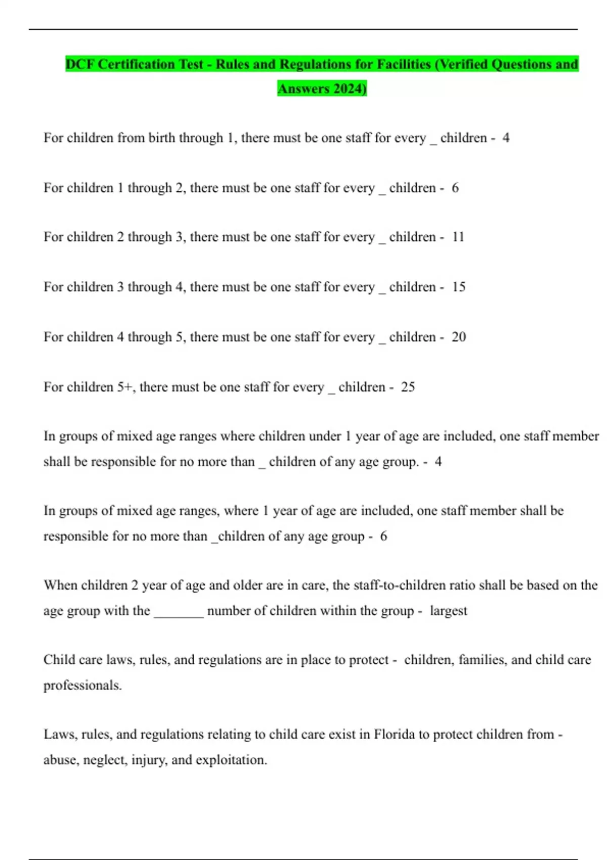 DCF Certification Test - Rules and Regulations for Facilities (Verified Questions and Answers 2024) For children from birth through 1, there must be one staff for every _ children - 4 For children 1 through 2, there must be one staff for every _ children - 6 For children 2 through 3, there must be one staff for every _ children - 11 For children 3 through 4, there must be one staff for every _ children - 15 For children 4 through 5, there must be one staff for every _ children - 20 For children 5+, there must be one staff for every _ children - 25 In groups of mixed age ranges where children under 1 year of age are included, one staff member shall be responsible for no more than _ children of any age group. - 4 In groups of mixed age ranges, where 1 year of age are included, one staff member shall be responsible for no more than _children of any age group - 6 When children 2 year of age and older are in care, the staff-to-children ratio shall be based on the age group with the _______ number of children within the group - largest Child care laws, rules, and regulations are in place to protect - children, families, and child care professionals. Laws, rules, and regulations relating to child care exist in Florida to protect children from - abuse, neglect, injury, and exploitation. Determine states rules pertaining to childcare and enforces these rules by licensing and inspecting childcare facilities - The Florida Department of children and families Inspects childcare facilities and educates child care professionals about minimizing fires & other threats to safety - Local fire departments; private investigators This agency determines ordinances pertaining to public health and inspects childcare facilities to enforce these ordinances - Local county health department