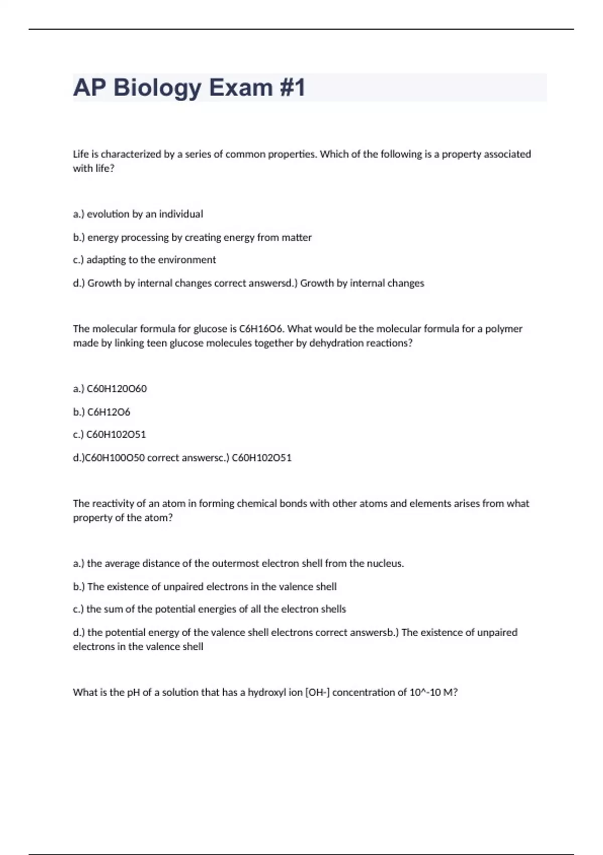 Life is characterized by a series of common properties. Which of the following is a property associated with life? a.) evolution by an individual b.) energy processing by creating energy from matter c.) adapting to the environment d.) Growth by internal changes correct answersd.) Growth by internal changes The molecular formula for glucose is C6H16O6. What would be the molecular formula for a polymer made by linking teen glucose molecules together by dehydration reactions? a.) C60H120O60 b.) C6H12O6 c.) C60H102O51 d.)C60H100O50 correct answersc.) C60H102O51 The reactivity of an atom in forming chemical bonds with other atoms and elements arises from what property of the atom? a.) the average distance of the outermost electron shell from the nucleus. b.) The existence of unpaired electrons in the valence shell c.) the sum of the potential energies of all the electron shells d.) the potential energy of the valence shell electrons correct answersb.) The existence of unpaired electrons in the valence shell What is the pH of a solution that has a hydroxyl ion [OH-] concentration of 10^-10 M?