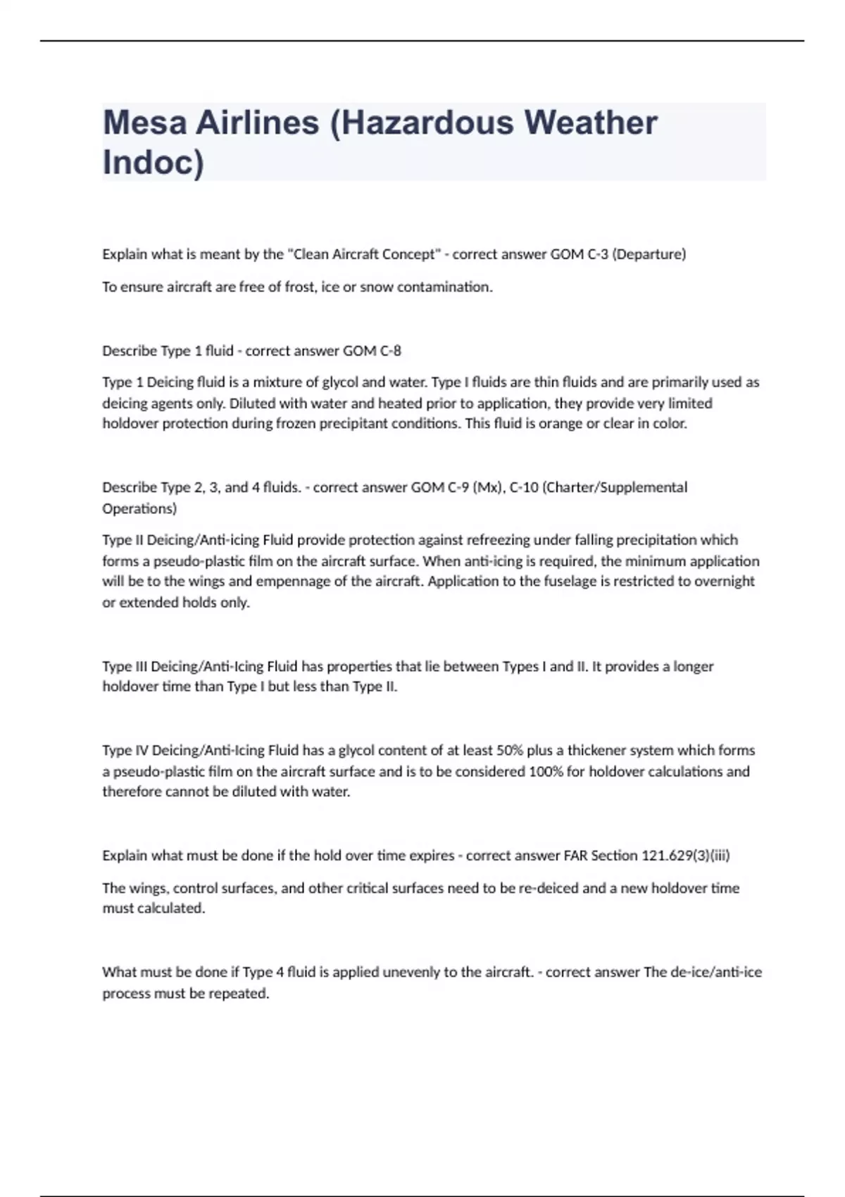 Mesa Airlines (Hazardous Weather Indoc) Explain what is meant by the "Clean Aircraft Concept" - correct answer GOM C-3 (Departure) To ensure aircraft are free of frost, ice or snow contamination. Describe Type 1 fluid - correct answer GOM C-8 Type 1 Deicing fluid is a mixture of glycol and water. Type I fluids are thin fluids and are primarily used as deicing agents only. Diluted with water and heated prior to application, they provide very limited holdover protection during frozen precipitant conditions. This fluid is orange or clear in color. Describe Type 2, 3, and 4 fluids. - correct answer GOM C-9 (Mx), C-10 (Charter/Supplemental Operations) Type II Deicing/Anti-icing Fluid provide protection against refreezing under falling precipitation which forms a pseudo-plastic film on the aircraft surface. When anti-icing is required, the minimum application will be to the wings and empennage of the aircraft. Application to the fuselage is restricted to overnight or extended holds only. Type III Deicing/Anti-Icing Fluid has properties that lie between Types I and II. It provides a longer holdover time than Type I but less than Type II. Type IV Deicing/Anti-Icing Fluid has a glycol content of at least 50% plus a thickener system which forms a pseudo-plastic film on the aircraft surface and is to be considered 100% for holdover calculations and therefore cannot be diluted with water. Explain what must be done if the hold over time expires - correct answer FAR Section 121.629(3)(iii) The wings, control surfaces, and other critical surfaces need to be re-deiced and a new holdover time must calculated. What must be done if Type 4 fluid is applied unevenly to the aircraft. - correct answer The de-ice/anti-ice process must be repeated. Explain what factors determine the effectiveness of deicing fluid - correct answer GOM C-7 (1) wind force and direction (2) amount and type of precipitation (3) temperature (4) activities taking place around the aircraft When does a hold over time begin? - correct answer GOM C-10 Hold Over Time starts at the beginning of the application with one-step de/anti-icing and with the beginning of the anti-icing process with two-step de/anti-icing. Explain a Pre-takeoff check. When must it be done? Can it be done from inside the cockpit? - correct answer GOM C-13 (APPENDIX) A check of the aircraft's wings for frost, ice or snow conducted within the aircraft's holdover time. This step is integral to the use of holdover times. This check can be performed by either the crew, or by qualified deicing personnel. Describe some of the effects of snow, ice, or frost while on the ground - correct answer GOM APPENDIX C.3 - C.4 (1) Increased Weight This could cause an aircraft to exceed its maximum allowable weight limitations or produce an excessive fuel burn, which may require an unscheduled landing. (2) Loss of Lift/Increased Drag Snow, ice or frost on the leading edge and wing surfaces increases drag and reduces lift on the aircraft. This increases the stall speed and cause reduced controllability, making flight difficult or impossible. (3) Loss of Control Ice deposits on control surfaces, such as the rudder, elevators, ailerons, and trim tabs can restrict or prohibit their movement. (4) Loss of Critical Sensing Devices Ice or snow blocking pitot probes, static port, engine pressure sensing probes, and other inlets can cause errors in critical instrument readings. What type of braking action report will cause Mesa to suspend operations?