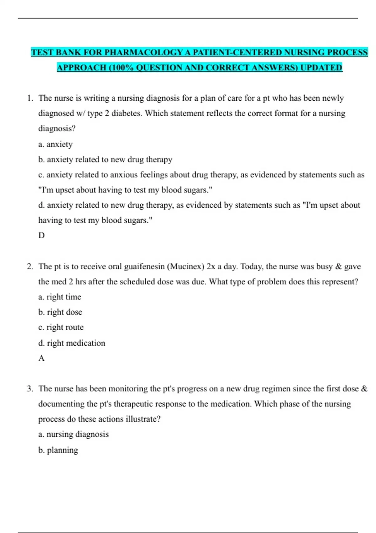 TEST BANK FOR PHARMACOLOGY A PATIENT-CENTERED NURSING PROCESS APPROACH (100% QUESTION AND CORRECT ANSWERS) UPDATED 1. The nurse is writing a nursing diagnosis for a plan of care for a pt who has been newly diagnosed w/ type 2 diabetes. Which statement reflects the correct format for a nursing diagnosis? a. anxiety b. anxiety related to new drug therapy c. anxiety related to anxious feelings about drug therapy, as evidenced by statements such as "I'm upset about having to test my blood sugars." d. anxiety related to new drug therapy, as evidenced by statements such as "I'm upset about having to test my blood sugars." D 2. The pt is to receive oral guaifenesin (Mucinex) 2x a day. Today, the nurse was busy & gave the med 2 hrs after the scheduled dose was due. What type of problem does this represent? a. right time b. right dose c. right route d. right medication A 3. The nurse has been monitoring the pt's progress on a new drug regimen since the first dose & documenting the pt's therapeutic response to the medication. Which phase of the nursing process do these actions illustrate? a. nursing diagnosis b. planning c. implementation d. evaluation D 4. The nurse is assigned to a pt who is newly diagnosed w/ type 1 diabetes mellitus. Which statement best illustrates an outcome criterion for this pt? a. the pt will follow instructions b. the pt will not experience complications c. the pt will adhere to the new insulin treatment regimen d. the pt will demonstrate correct blood glucose testing technique D 5. Which activity best reflects the implementation phase of the nursing process for the pt who is newly diagnosed w/ HTN? a. providing education on keeping a journal of BP readings b. setting goals & outcome criteria w/ the pt's input c. recording a drug history regarding OTC medications used at home d. formulating nursing diagnoses regarding deficient knowledge r/t the new treatment regimen A 6. The medication order reads, "Give ondansetron (Zofran) 4 mg, 30 mins before beginning chemotherapy to prevent nausea." The nurse notes that the route is missing from the order. What is the nurse's best action? a. give the medication intravenously b/c the pt might vomit b. give the medication orally b/c the tablet are available in 4 mg doses c. contact the prescriber to clarify the route of the medication ordered d. hold the medication until the prescriber returns to make rounds C 7. When the nurse considers the timing of a drug dose, which factor is appropriate to consider when deciding when to give a drug? a. the pt's ability to swallow b. the pt's height c. the pt's last meal d. the pt's allergies C 8. The nurse is performing an assessment of a newly admitted pt. Which is an example of subjective data? a. BP 158/96 mm Hg b. weight 255 lbs c. pt reports that he uses the herbal product ginkgo d. the pt's lab work includes a complete blood count & urinalysis C 9. The pt is receiving 2 different drugs. At current dosages & dosage forms, both drugs are absorbed into the circulation in identical amounts. Which term is used to identify this principle? a. bioequivalent b. synergistic c. prodrugs d. steady state A 10. The nurse is administering parenteral drugs. Which statement is true regarding parenteral drugs? a. parenteral drugs bypass the first-pass effect b. absorption of parenteral drugs is affected by reduced blood flow to the stomach c. absorption of parenteral drugs is faster when the stomach is empty d. parenteral drugs exert their effects while circulating in the bloodstream A 11. When monitoring the pt receiving an intraveous infusion to reduce BP, the nurse notes that the pt's BP is extremely low, & the pt is lethargic & difficult to awaken. This would be classified as which type of adverse drug reaction? a. adverse effect b. allergic reaction c. idiosyncratic reaction d. pharmacologic reaction D