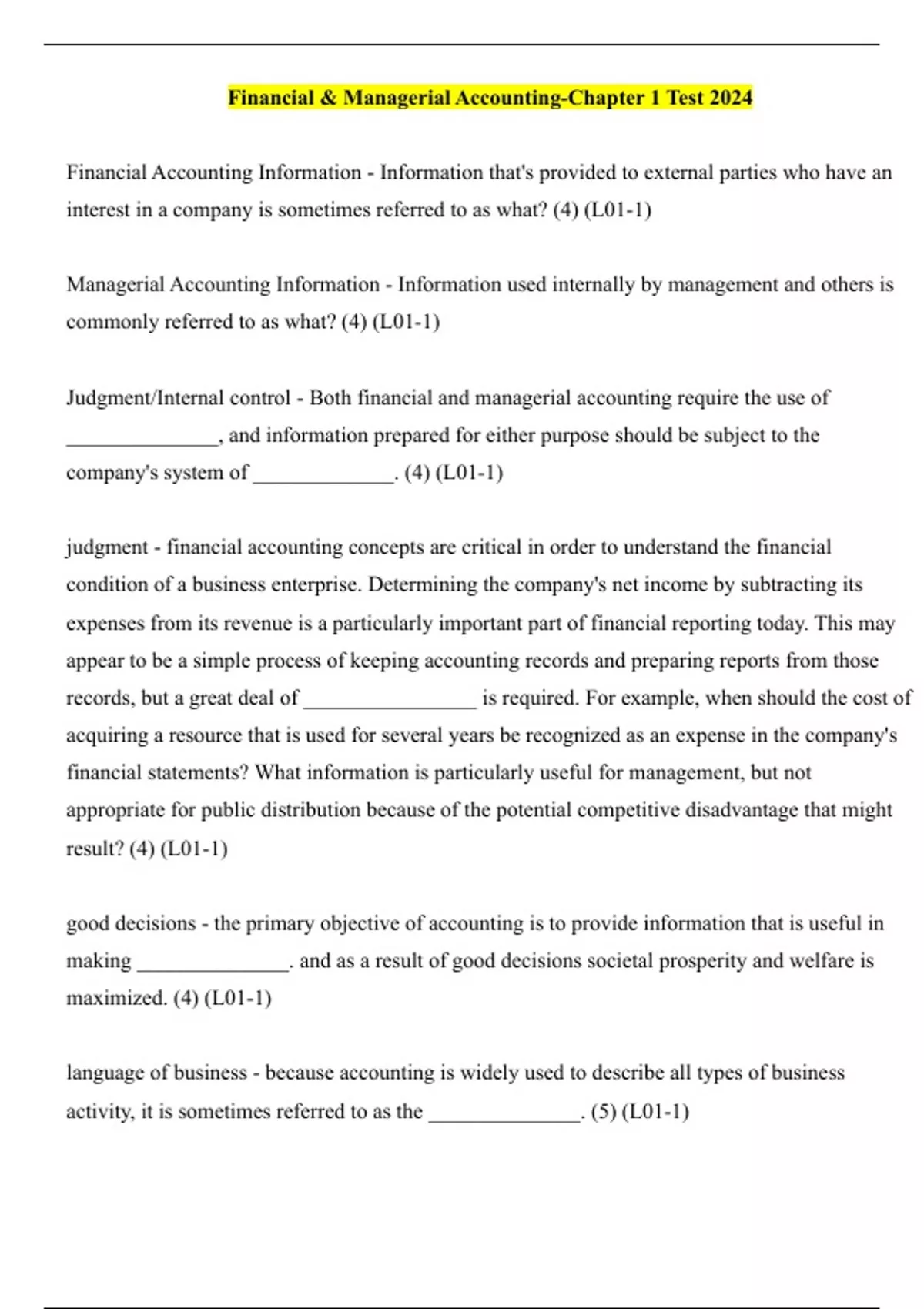 Financial & Managerial Accounting-Chapter 1 Test 2024 Financial Accounting Information - Information that's provided to external parties who have an interest in a company is sometimes referred to as what? (4) (L01-1) Managerial Accounting Information - Information used internally by management and others is commonly referred to as what? (4) (L01-1) Judgment/Internal control - Both financial and managerial accounting require the use of ______________, and information prepared for either purpose should be subject to the company's system of _____________. (4) (L01-1) judgment - financial accounting concepts are critical in order to understand the financial condition of a business enterprise. Determining the company's net income by subtracting its expenses from its revenue is a particularly important part of financial reporting today. This may appear to be a simple process of keeping accounting records and preparing reports from those records, but a great deal of ________________ is required. For example, when should the cost of acquiring a resource that is used for several years be recognized as an expense in the company's financial statements? What information is particularly useful for management, but not appropriate for public distribution because of the potential competitive disadvantage that might result? (4) (L01-1) good decisions - the primary objective of accounting is to provide information that is useful in making ______________. and as a result of good decisions societal prosperity and welfare is maximized. (4) (L01-1) language of business - because accounting is widely used to describe all types of business activity, it is sometimes referred to as the ______________. (5) (L01-1) costs, prices, sales volume, profits, and return on investment - _____________ are all accounting measurements. (5) (L01-1) accounting information - _____________________ is the means by which we measure and communicate economic events. (5) (L01-1) Financial Accounting - __________________ refers to information describing the financial resources, obligations, and activities of an economic entity (either in organization or an individual). (6) (L01-1) financial position - Accountants use the term _______________ to describe an entity's financial resources and obligations at a point in time. (6) (L01-1) results of operations - Accountants use the term ____________ to describe an entity's financial activities during the year. (6) (L01-1) financial accounting information - ________________ is designed primarily to assist investors and creditors in deciding where to place their scarce investment resources. Such decisions are important to society, because they determine which companies and industries will receive the financial resources necessary for growth. (6)(L01-1) capital - When ________________, which is a scarce resource, is allocated wisely, the overall prosperity of society is maximized. (6)(L01-1) general-purpose - financial accounting information is also used by managers and income tax returns. In fact, financial accounting information is used for so many different purposes that it is often called _______________ accounting information. (6)(L01-1) management/managerial accounting - ________________ or _______________ involves the development and interpretation of accounting information intended specifically to assist management in operating the business. Management use this information in setting the company's overall goals, evaluating the performance of departments and individuals, deciding whether to introduce a new line of products, and making virtually all types of managerial decisions. (6) (L01-1) daily business operations - a company's managers and employees constantly need information to run and control _______________. they need to know the amount of money in the company's bank accounts; the types, quantities, and dollar amounts of merchandise in the company's warehouse; and the amounts owed to specific creditors. (6) (L01-1) accounting system - An ___________________ consists of the personal, procedures, technology, and records used by an organization to develop accounting information and to communicate this information to decision-makers. (7) (L01-2) accounting systems - In small businesses __________________ may consist of little more than a cash register, a checkbook, and an annual trip to an income tax preparer. (7) (L01-2) accounting systems - In large businesses, ___________________ include computers, highly trained personnel, and accounting reports that affect the daily operations of every department. (7) (L01-2)