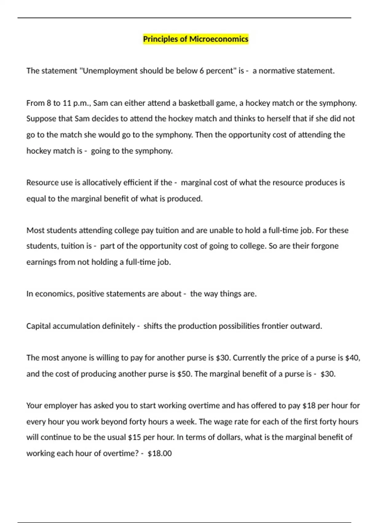 Principles of Microeconomics The statement "Unemployment should be below 6 percent" is - a normative statement. From 8 to 11 p.m., Sam can either attend a basketball game, a hockey match or the symphony. Suppose that Sam decides to attend the hockey match and thinks to herself that if she did not go to the match she would go to the symphony. Then the opportunity cost of attending the hockey match is - going to the symphony. Resource use is allocatively efficient if the - marginal cost of what the resource produces is equal to the marginal benefit of what is produced. Most students attending college pay tuition and are unable to hold a full-time job. For these students, tuition is - part of the opportunity cost of going to college. So are their forgone earnings from not holding a full-time job. In economics, positive statements are about - the way things are. Capital accumulation definitely - shifts the production possibilities frontier outward. The most anyone is willing to pay for another purse is $30. Currently the price of a purse is $40, and the cost of producing another purse is $50. The marginal benefit of a purse is - $30. Your employer has asked you to start working overtime and has offered to pay $18 per hour for every hour you work beyond forty hours a week. The wage rate for each of the first forty hours will continue to be the usual $15 per hour. In terms of dollars, what is the marginal benefit of working each hour of overtime? - $18.00 Which of the following describes comparative advantage? - To produce a bushel of wheat Farmer John must give up 2 bushels of corn whereas Farmer Ben must give up 3 bushels of corn. The principle of decreasing marginal benefit means that as the quantity of a good consumed - increases, its marginal benefit decreases. According to economists, - market capitalism is the best system available and some government intervention and regulation can either help or harm the social interest. Missouri can produce 10,000 tons of pecans per year or 5,000 tons of pears per year. Washington can produce 12,000 tons of pecans per year or 48,000 tons of pears per year. Which of the following statements is true? - Washington has an absolute advantage in the production of both pecans and pears. Suppose Joe can prepare 20 sandwiches or 10 pizzas in an hour and Beth can produce 36 sandwiches or 27 pizzas. The concept of comparative advantage concludes that - Beth should produce pizza and Joe should produce sandwiches. Abe can catch 10 pounds of fish an hour or pick 10 pounds of fruit. Zeb can catch 30 pounds of fish an hour or pick 20 pounds of fruit. The opportunity cost of fish is ________ for Abe than for Zeb, and the opportunity cost of fruit is ________ for Abe than for Zeb. - higher; lower