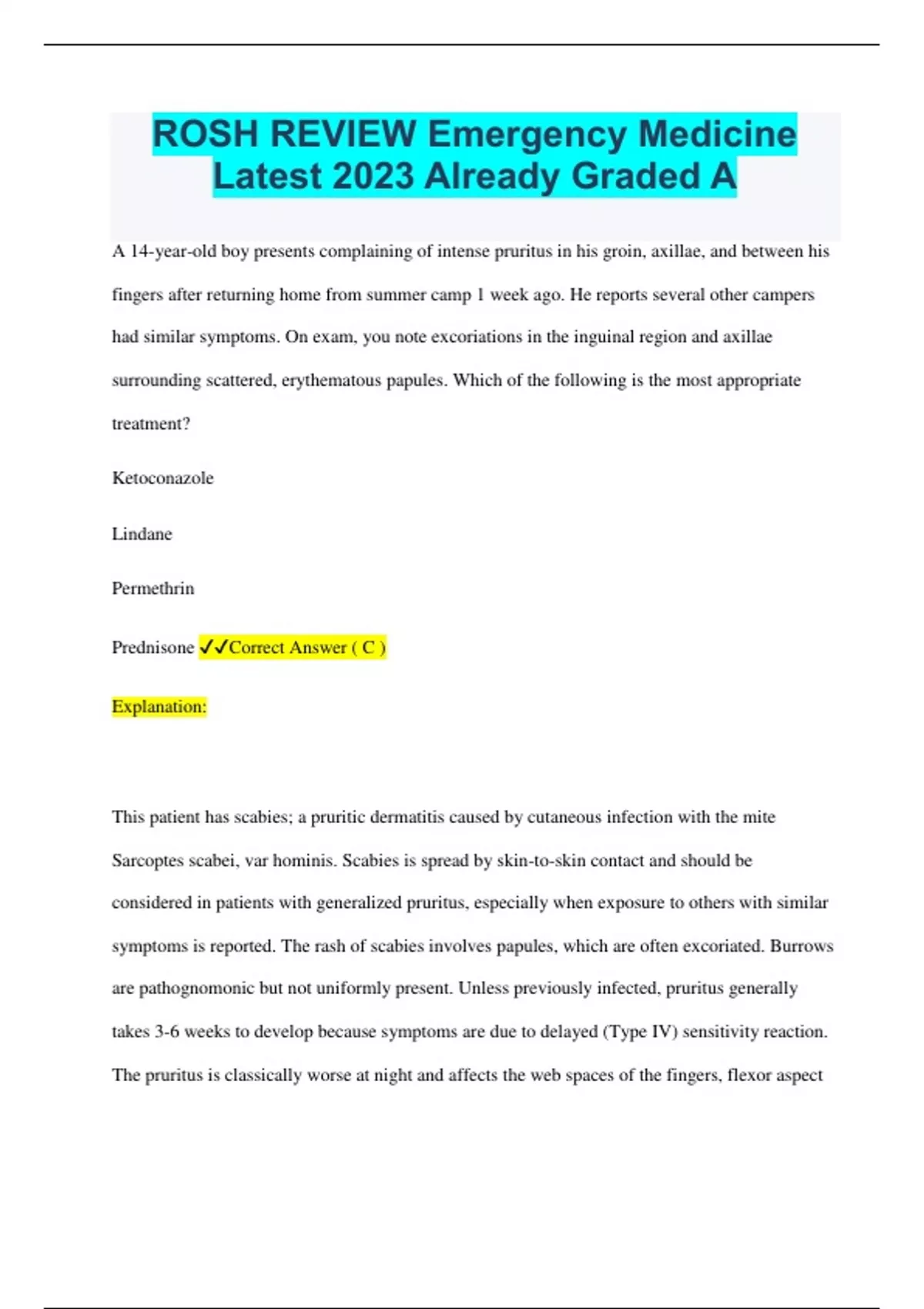 ROSH REVIEW Emergency Medicine Latest 2023 Already Graded A A 14-year-old boy presents complaining of intense pruritus in his groin, axillae, and between his fingers after returning home from summer camp 1 week ago. He reports several other campers had similar symptoms. On exam, you note excoriations in the inguinal region and axillae surrounding scattered, erythematous papules. Which of the following is the most appropriate treatment? Ketoconazole Lindane Permethrin Prednisone Correct Answer ( C ) Explanation: This patient has scabies; a pruritic dermatitis caused by cutaneous infection with the mite Sarcoptes scabei, var hominis. Scabies is spread by skin-to-skin contact and should be considered in patients with generalized pruritus, especially when exposure to others with similar symptoms is reported. The rash of scabies involves papules, which are often excoriated. Burrows are pathognomonic but not uniformly present. Unless previously infected, pruritus generally takes 3-6 weeks to develop because symptoms are due to delayed (Type IV) sensitivity reaction. The pruritus is classically worse at night and affects the web spaces of the fingers, flexor aspect of the wrists, axillae, groin, nipples, and the periumbilical region. Except in cases involving an immunocompromised host, the scalp and face are generally spared. Diagnosis is clinical but can be confirmed by placing scrapings collected with a #15 blade scalpel in mineral oil for microscopic examination. The treatment of choice for primary scabies infection is the application of topical scabicidal agents, with repeat application in 7 days. The treatment of choice is permethrin 5% lotion. Individuals affected by scabies should avoid skin-to-skin contact with others. Patients with typical scabies may return to school or work 24 hours after the first treatment. Should family members of an infected individual also be treated for scabies? Yes, family members and sexual contacts. Scabies Sarcoptes scabiei Pruritic rash worse at night Linear burrows Interdigital spaces of hands/feet, penis, breasts Permethrin (first line) Ivermectin **head and back are sparred (head involved in children) An 18-month-old boy presents to the emergency department with worsening shortness of breath. The parents report he has had a cough, runny nose, and fussiness for the past five days. On exam, the patient demonstrates subcostal retractions, tachypnea, and diffuse wheezing. The patient is given an albuterol nebulizer treatment without any improvement of his wheezing. Chest X-ray does not show any abnormality. Which of the following organisms is the most likely cause of his symptoms? Bordetella pertussis Haemophilus influenzae Parainfluenza virus Respiratory syncytial virus Correct Answer ( D ) Explanation: The patient has bronchiolitis, which is the most common lower respiratory tract infection in patients less than two years of age. It remains the leading cause for hospitalization in infants under one year of age. Bronchiolitis is most commonly caused by respiratory syncytial virus (RSV), but may be caused by other viral agents. Bronchiolitis is inflammation of the lower respiratory tract, which involves edema, epithelial cell necrosis, bronchospasm, and increased mucus production. The resultant lower airway obstruction causes increased work of breathing and wheezing. Bronchiolitis is a clinical diagnosis based on age under two years old, rhinorrhea, tachypnea, and wheezing. Unlike asthma or reactive airway disease, there is often no significant improvement with albuterol. There is often a history of several days of upper respiratory symptoms, such as rhinorrhea, mild cough, and mild fever. Rapid antigen tests, blood work, and radiographs are not usually needed. Radiographs may demonstrate hyperinflation and atelectasis, but do not show any focal infiltrates like with pneumonia. Bronchiolitis is usually self-limited, with respiratory status typically improving over 2-5 days. Management involves supportive care. Bronchiolitis What months of the year contain the peak incidence of RSV in North America? November to March. A 76-year-old man presents to the emergency department with shortness of breath and lightheadedness. Vital signs include blood pressure 70/56 mm Hg, heart rate 124 beats/minute, respiratory rate 22 breaths/minute, and temperature 37.6°C. He has distended neck veins and occasional dropped radial beats. His lungs are clear to auscultation, but his heart sounds are distant. He has some fullness to palpation of the right upper quadrant of his abdomen. Which of the following is the most appropriate diagnostic test? Bedside echocardiography Chest radiograph Computed tomography angiogram of the chest Electrocardiogram Correct Answer ( A ) Explanation: This patient presents with a clinical picture consistent with obstructive shock. His distended neck veins, full right upper quadrant, muffled heart sounds, and hypotension are all consistent with pericardial tamponade. A pericardial sac slowly accumulating fluid can stretch without obstructing cardiac function. Tamponade occurs when rapid fluid accumulation results in elevated pressures that inhibit venous return. This is a dynamic process over the course of the cardiac cycle, therefore bedside echocardiography is the diagnostic test of choice. Fluid around the heart with evidence of right atrial compression and right ventricular diastolic collapse are diagnostic of pericardial tamponade. Pericardial Effusion What is the emergent treatment of pericardial tamponade? Pericardiocentesis. An 8-year-old African-American girl with a history of sickle cell anemia presents with diffuse pain consistent with an acute sickle cell pain crisis. While in the emergency department, she develops acute onset headache, right sided facial droop and right arm weakness. A CT scan confirms the diagnosis. Which of the following is the next best step in management? Alteplase Exchange transfusion MRI brain Tranexamic acid Correc