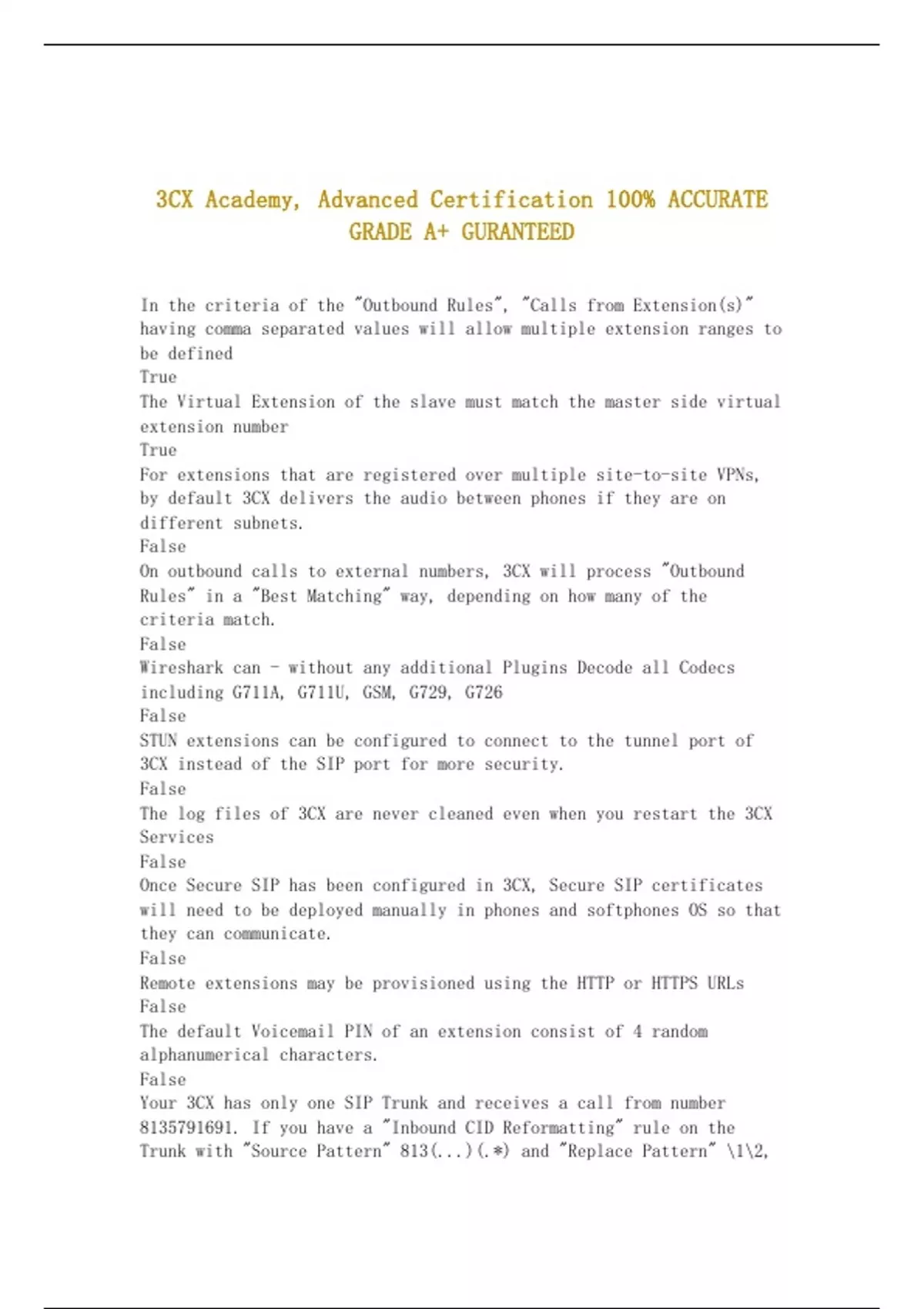In the criteria of the "Outbound Rules", "Calls from Extension(s)" having comma separated values will allow multiple extension ranges to be defined True The Virtual Extension of the slave must match the master side virtual extension number True For extensions that are registered over multiple site-to-site VPNs, by default 3CX delivers the audio between phones if they are on different subnets. False On outbound calls to external numbers, 3CX will process "Outbound Rules" in a "Best Matching" way, depending on how many of the criteria match. False Wireshark can - without any additional Plugins Decode all Codecs including G711A, G711U, GSM, G729, G726 False STUN extensions can be configured to connect to the tunnel port of 3CX instead of the SIP port for more security. False The log files of 3CX are never cleaned even when you restart the 3CX Services False Once Secure SIP has been configured in 3CX, Secure SIP certificates will need to be deployed manually in phones and softphones OS so that they can communicate. False Remote extensions may be provisioned using the HTTP or HTTPS URLs False The default Voicemail PIN of an extension consist of 4 random alphanumerical characters. False Your 3CX has only one SIP Trunk and receives a call from number . If you have a "Inbound CID Reformatting" rule on the Trunk with "Source Pattern" 813(...)(.*) and "Replace Pattern" 12, the extension that receives the call will see "5791691" as the caller ID on its display. True When 3CX has been installed without a FQDN from 3CX and in split DNS mode, the DNS server must not be installed on the same machine as the phone system. True Your Local IP Phone loses the registration to 3CX and you want do troubleshoot the issue. You should start a Wireshark Capture on the 3CX Server, reboot the phone, and then apply the Filter sip.Cseq.Method==REGISTER in order to see if registrations are reaching 3CX True Your 3CX has only one SIP Trunk and receives a call from number and you want it to be presented on the extension display as . You can do this with a "Inbound CID Reformatting" rule on the Trunk with "Source Pattern" 44(..)(..)(.*) and "Replace Pattern" +443. True When selecting the option "I need a 3CX FQDN" an internal DNS is not mandatory True The order of "Inbound Rules" is not important when you have DID and CID "Inbound Rules", CIDs always have higher priority. False You have a Master Bridge with 3-digit extensions 1xxx and a Slave Bridge with 4-digit extensions 2xxx. In the "Outbound Rules" you use to rote calls across the bridge, using a prefix is mandatory. False You have run the 3CX "Firewall Checker" and comes up as Green, but you still have audio issues and calls dropping on on outbound / inbound calls. Can SIP ALG be the culprit? True An extension will be allowed up to 25 attempts (default) for authenticating successfully, after what it will be blacklisted for the default blacklisting interval of 1800 minutes. False The 3CX SIP port should be filtered by firewall ACL rules to maximize security and allow only trusted IPs to reach it (VoIP providers or STUN extensions if any). True SRTP will secure calls so that a middle-man can't see the SIP traffic in plain-text. False.CONTINUED...