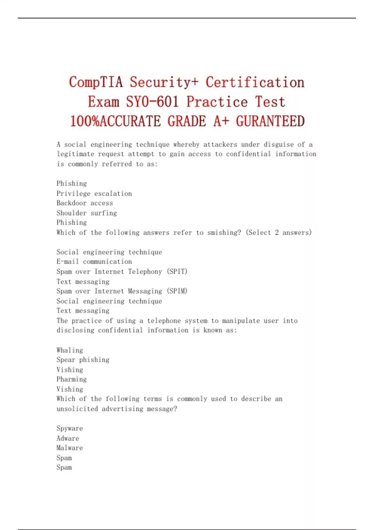 A social engineering technique whereby attackers under disguise of a legitimate request attempt to gain access to confidential information is commonly referred to as: Phishing Privilege escalation Backdoor access Shoulder surfing Phishing Which of the following answers refer to smishing? (Select 2 answers) Social engineering technique E-mail communication Spam over Internet Telephony (SPIT) Text messaging Spam over Internet Messaging (SPIM) Social engineering technique Text messaging The practice of using a telephone system to manipulate user into disclosing confidential information is known as: Whaling Spear phishing Vishing Pharming Vishing Which of the following terms is commonly used to describe an unsolicited advertising message? Spyware Adware Malware Spam Spam What type of spam relies on text-based communication? Vishing SPIM Bluesnarfing SPIT SPIM Phishing scams targeting a specific group of people are referred to as: Vishing Spear phishing Spoofing Whaling Spear phishing In computer security, the term "Dumpster diving" is used to describe a practice of sifting through trash for discarded documents containing sensitive data. Found documents containing names and surnames of the employees along with the information about positions held in the company and other data can be used to facilitate social engineering attacks. Having the documents shredded or incinerated before disposal makes dumpster diving less effective and mitigates the risk of social engineering attacks. True False True A situation in which an unauthorized person can view another user's display or keyboard to learn their password or other confidential information is referred to as: Spear phishing Tailgating Shoulder surfing Spoofing Shoulder surfing Which of the following answers refer to the characteristic features of pharming? (Select 3 answers) Domain hijacking Traffic redirection Fraudulent website Password attack Credential harvesting Traffic redirection Fraudulent website Credential harvesting What is tailgating? Acquiring unauthorized access to confidential data Looking over someone's shoulder to get information Gaining unauthorized access to restricted areas by following another person Manipulating a user into disclosing confidential information Gaining unauthorized access to restricted areas by following another person In social engineering, the term "Elicitation" describes the use of casual conversation to extract non-public information from people without giving them the feeling they are being interrogated. True False True 1. Bracketing 2. Confidential bait 3. Deliberate false statements 4. Feigned ignorance 5. Denial of the obvious 6. Flattery 1. Providing a high and low estimate in order to entice a more specific number 2. Pretending to divulge confidential information in hopes of receiving confidential information in return 3. Saying something wrong in the hopes that the person will correct the statement with true information 4. Pretending to be ignorant of a topic in order to exploit the person's tendency to educate 5. Saying something wrong in the hopes that the person will correct the statement with true information 6. Using praise to coax a person into providing information Phishing scams targeting people holding high positions in an organization or business are known as: Vishing Smishing Whaling Pharming Whaling CONTINUED.....