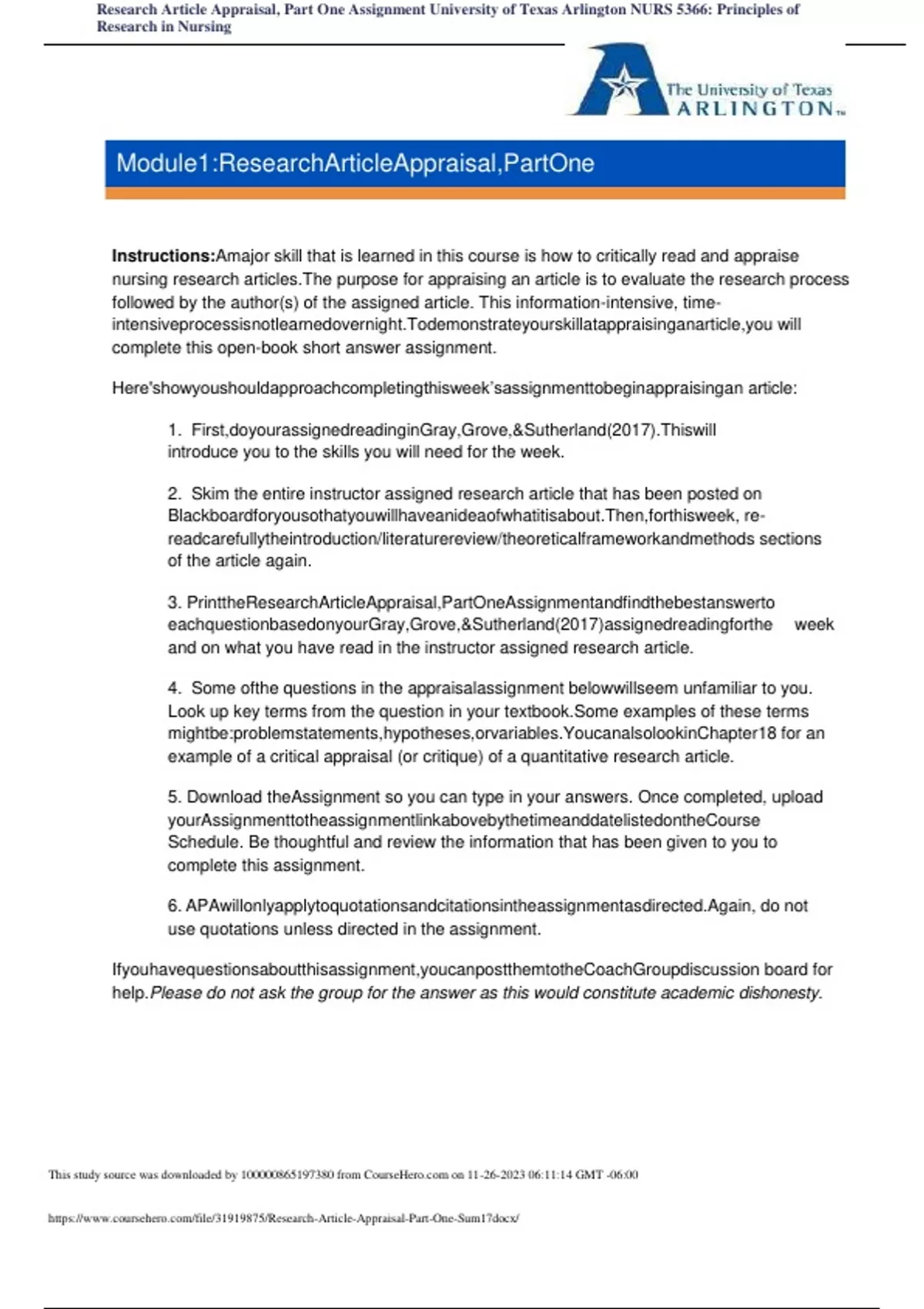 Research Article Appraisal, Part One Assignment University of Texas Arlington NURS 5366 Principles of Research in Nursing