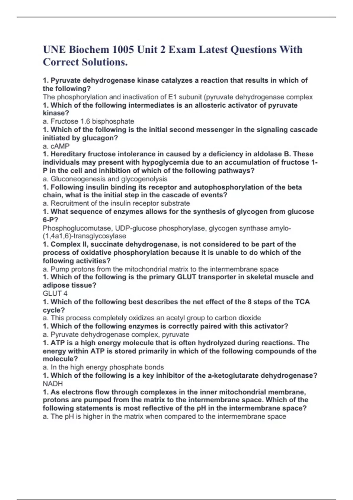 UNE Biochem 1005 Unit 2 Exam Latest Questions With Correct Solutions. 1. Pyruvate dehydrogenase kinase catalyzes a reaction that results in which of the following? The phosphorylation and inactivation of E1 subunit (pyruvate dehydrogenase complex 1. Which of the following intermediates is an allosteric activator of pyruvate kinase? a. Fructose 1.6 bisphosphate 1. Which of the following is the initial second messenger in the signaling cascade initiated by glucagon? a. cAMP 1. Hereditary fructose intolerance in caused by a deficiency in aldolase B. These individuals may present with hypoglycemia due to an accumulation of fructose 1-P in the cell and inhibition of which of the following pathways? a. Gluconeogenesis and glycogenolysis 1. Following insulin binding its receptor and autophosphorylation of the beta chain, what is the initial step in the cascade of events? a. Recruitment of the insulin receptor substrate 1. What sequence of enzymes allows for the synthesis of glycogen from glucose