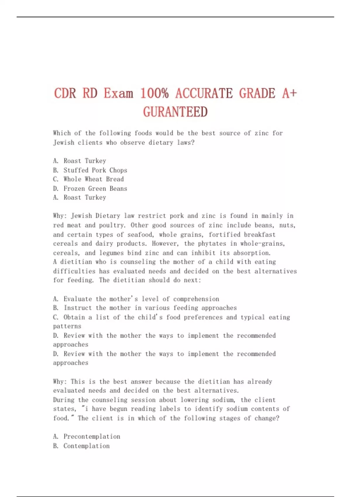 CDR RD Exam 100% ACCURATE GRADE A+ GURANTEED