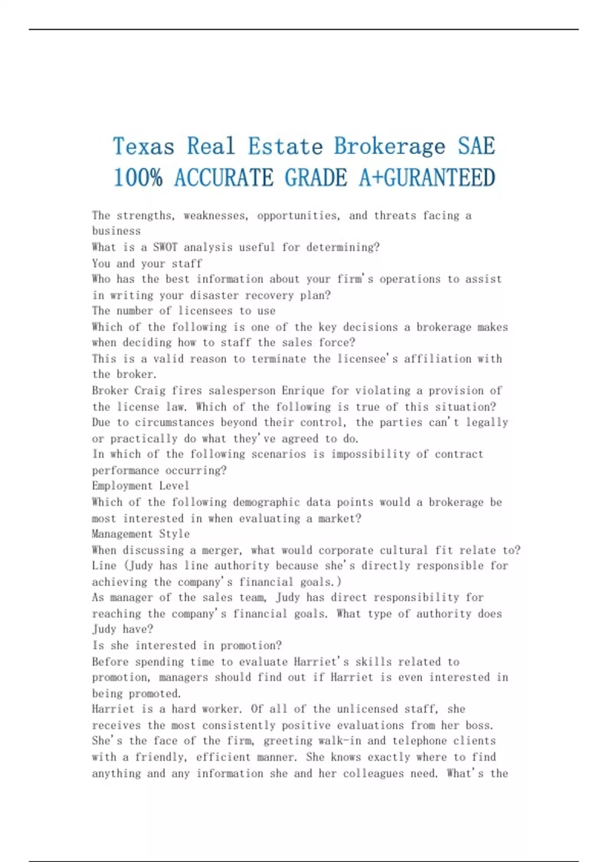 Texas Real Estate Brokerage SAE 100% ACCURATE GRADE A+GURANTEED