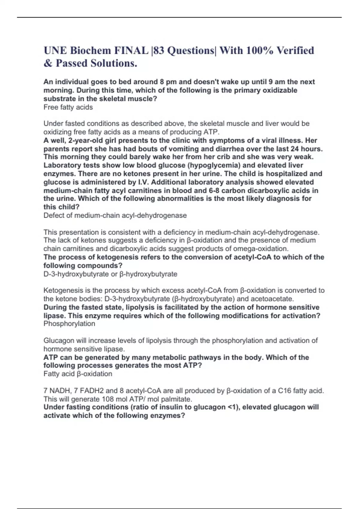 UNE Biochem FINAL |83 Questions| With 100% Verified & Passed Solutions. An individual goes to bed around 8 pm and doesn't wake up until 9 am the next morning. During this time, which of the following is the primary oxidizable substrate in the skeletal muscle? Free fatty acids Under fasted conditions as described above, the skeletal muscle and liver would be oxidizing free fatty acids as a means of producing ATP. A well, 2-year-old girl presents to the clinic with symptoms of a viral illness. Her parents report she has had bouts of vomiting and diarrhea over the last 24 hours. This morning they could barely wake her from her crib and she was very weak. Laboratory tests show low blood glucose (hypoglycemia) and elevated liver enzymes. There are no ketones present in her urine. The child is hospitalized and glucose is administered by I.V. Additional laboratory analysis showed elevated medium-chain fatty acyl carnitines in blood and 6-8 carbon dicarboxylic acids in the urine. Which of the following abnormalities is the most likely diagnosis for this child? Defect of medium-chain acyl-dehydrogenase This presentation is consistent with a deficiency in medium-chain acyl-dehydrogenase. The lack of ketones suggests a deficiency in β-oxidation and the presence of medium chain carnitines and dicarboxylic acids suggest products of omega-oxidation.