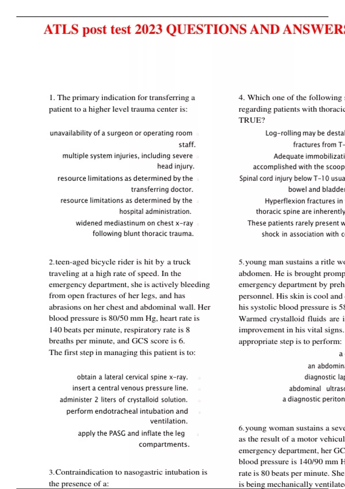 ATLS post test 2023 QUESTIONS AND ANSWERS Course Medicine 108 Institution Medicine 108 1. The primary indication for transferring a1. The primary indication for transferring a patient to a higher level trauma center is: patient to a higher level trauma center is:unavailability of a surgeon or operating roomunavailability of a surgeon or operating .multiple system injuries, including severemultiple system injuries, including severehead injury.resource limitations as determined by theresource limitations as determined by thetransferring ferring doctor.resource limitations as determined by theresource limitations as determined by thehospital tal administration.widened mediastinum on chest x-raywidened mediastinum on chest x-rayfollowing blunt thoracic wing blunt thoracic trauma.2. teen-aged bicycle rider is hit b2. teen-aged bicycle rider is hit by a trucky a trucktraveling at a high rate of speed. traveling at a high rate of speed. In theIn theemergency department, she is actively bleedingemergency department, she is actively bleedingfrom open fractures of her legs, and hasfrom open fractures of her legs, and hasabrasions on her chest and abdominal abrasions on her chest and abdominal wall. Herwall. Her blood pressure is 80/50 mm Hg, heart rate is blood pressure is 80/50 mm Hg, heart rate is140 beats per minute, respiratory rate is 8140 beats per minute, respiratory rate is 8 breaths per minute, and GCS score is 6. breaths per minute, and GCS score is 6.The first step in managing this patient is to:The first step in managing this patient is to:obtain a lateral cervical spine n a lateral cervical spine x-ray.insert a central venous pressure t a central venous pressure line.administer 2 liters of crystalloid ister 2 liters of crystalloid solution.perform endotracheal intubation andperform endotracheal intubation lation.apply the PASG and inflate the legapply the PASG and inflate the rtments.3. Contraindication to nasogastric intubation is3. Contraindication to nasogastric intubation isthe presence of a:the presence of a:gastric ic perforation.diaphragmatic ragmatic rupture.open depressed skull depressed skull fracture.fracture of the cervical ure of the cervical spine.fracture of the cribriform ure of the cribriform plate.4. Which one of the following statements4. Which one of the following statementsregarding patients with thoracic spine injuries isregarding patients with thoracic spine injuries isTRUE?TRUE?Log-rolling may be Log-rolling may be destabilizing todestabilizing tofractures from T-12 to L-ures from T-12 to L-1.Adequate immobilization can beAdequate immobilization can beaccomplished with the scoop plished with the scoop stretcher.Spinal cord injury below T-10 usually sparesSpinal cord injury below T-10 usually sparesbowel and bladder and bladder function.Hyperflexion fractures in the upperHyperflexion fractures in the upperthoracic spine are inherently cic spine are inherently unstable.These patients rarely present with spinalThese patients rarely present with spinalshock in association with cord in association with cord injury.5. young man sustains a ritle wound to the mid-5. young man sustains a ritle wound to the mid-abdomen. He is brought promptly to theabdomen. He is brought promptly to theemergency department by prehospitalemergency department by prehospital personnel. His skin is cool and diaphoretic, and personnel. His skin is cool and diaphoretic, andhis systolic blood pressure is 58 rnm H systolic blood pressure is 58 rnm Hg.WWarmed crystalloid fluids are armed crystalloid fluids are initiated withoutinitiated withoutimprovement in his vital signs. The next, mostimprovement in his vital signs. The next, mostappropriate step is to perform:appropriate step is to perform:a celiotomy.a celiotomy.an abdominal CT abdominal CT scan.diagnostic ostic laparoscopy.abdominal inal ultrasonography.a diagnostic peritoneal lavage.a diagnostic peritoneal lavage.6. young woman sustains a severe he6. young woman
