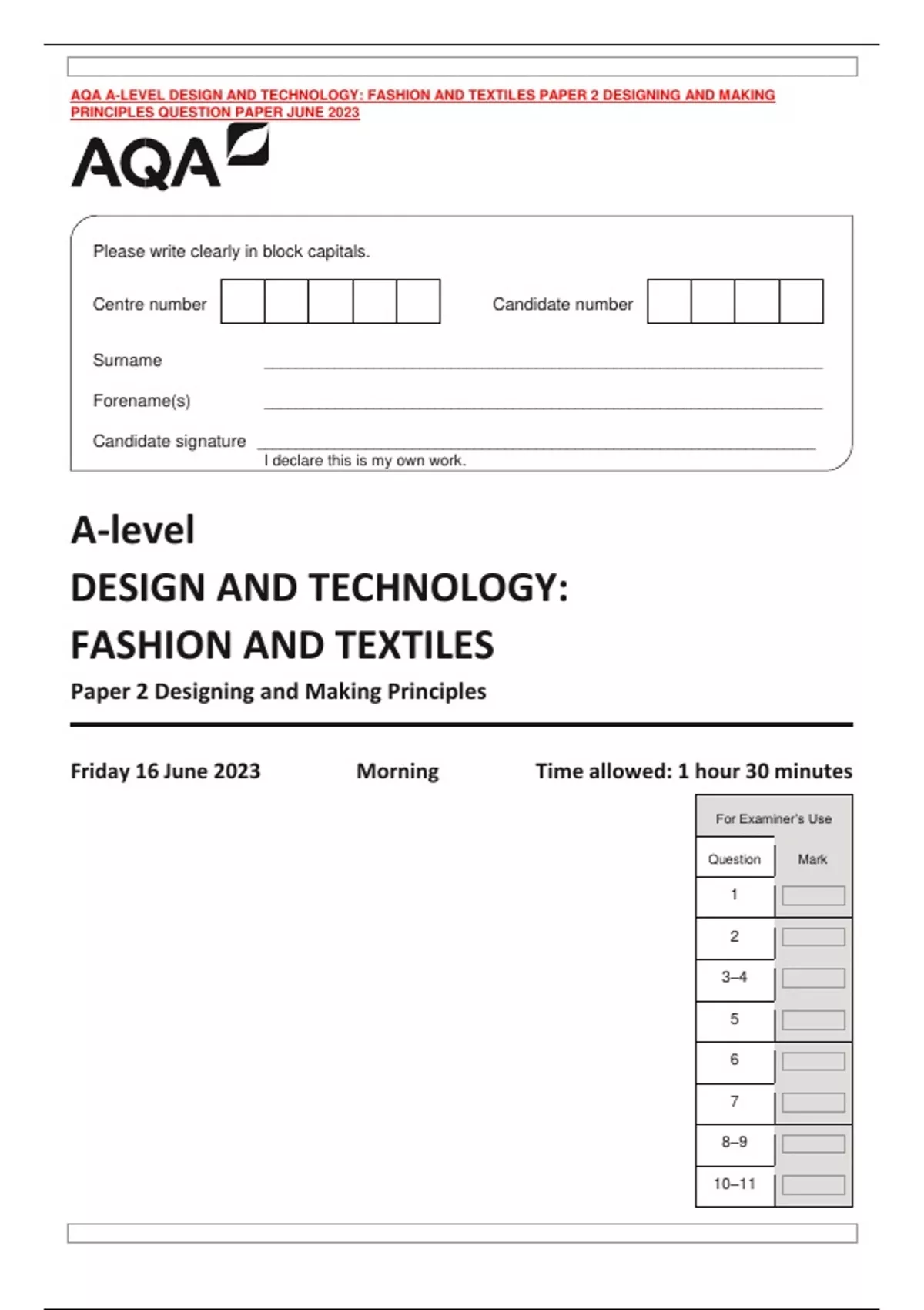 AQA A-LEVEL DESIGN AND TECHNOLOGY: FASHION AND TEXTILES PAPER 2 DESIGNING AND MAKING