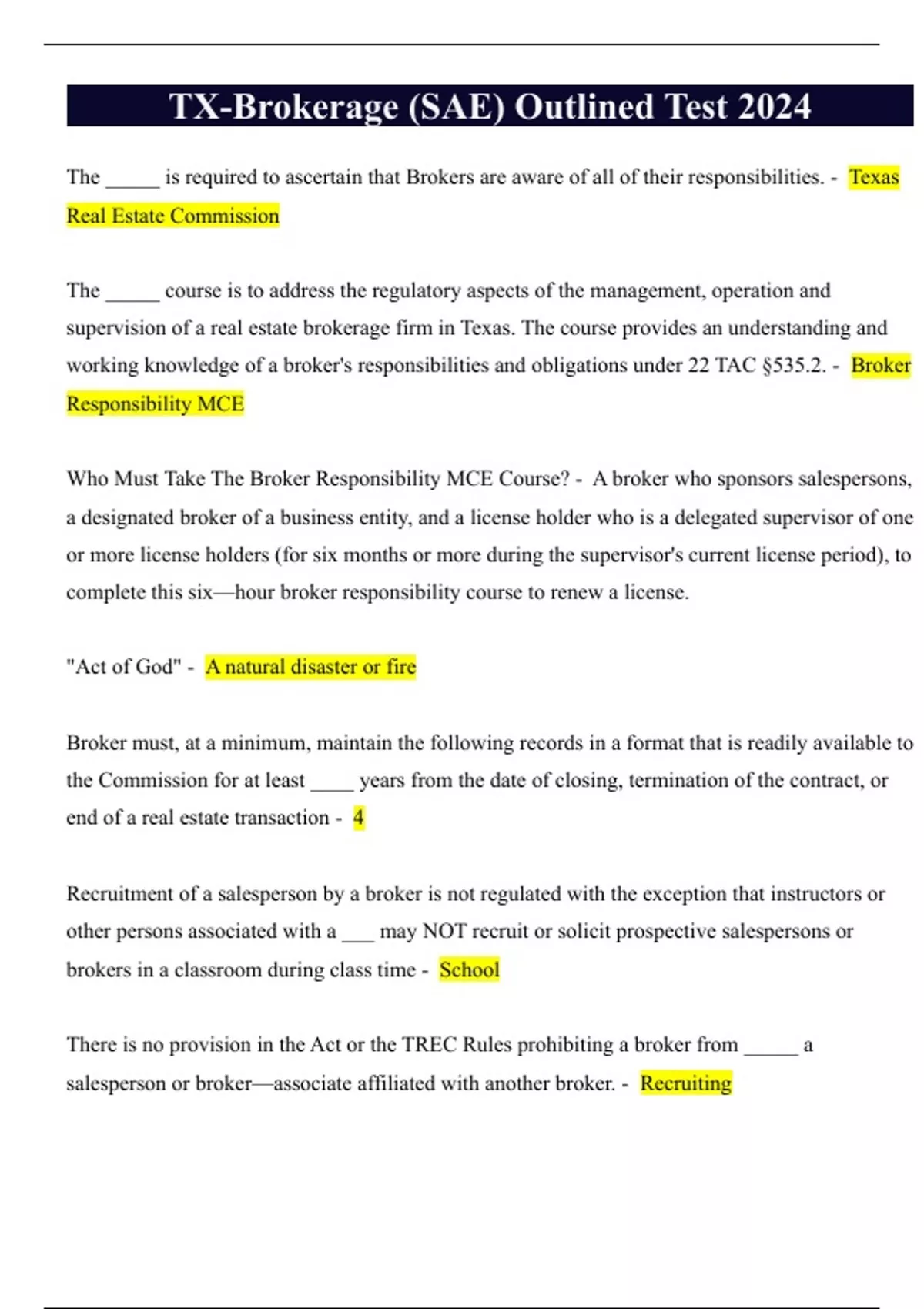 TX-Brokerage (SAE) Outlined Test 2024 The _____ is required to ascertain that Brokers are aware of all of their responsibilities. - Texas Real Estate Commission The _____ course is to address the regulatory aspects of the management, operation and supervision of a real estate brokerage firm in Texas. The course provides an understanding and working knowledge of a broker's responsibilities and obligations under 22 TAC §535.2. - Broker Responsibility MCE Who Must Take The Broker Responsibility MCE Course? - A broker who sponsors salespersons, a designated broker of a business entity, and a license holder who is a delegated supervisor of one or more license holders (for six months or more during the supervisor's current license period), to complete this six—hour broker responsibility course to renew a license. "Act of God" - A natural disaster or fire Broker must, at a minimum, maintain the following records in a format that is readily available to the Commission for at least ____ years from the date of closing, termination of the contract, or end of a real estate transaction - 4 Recruitment of a salesperson by a broker is not regulated with the exception that instructors or other persons associated with a ___ may NOT recruit or solicit prospective salespersons or brokers in a classroom during class time - School There is no provision in the Act or the TREC Rules prohibiting a broker from _____ a salesperson or broker—associate affiliated with another broker. - Recruiting ________ are exempt from any of the provisions of the Texas Real Estate License Act. They are permitted to represent clients in real estate transactions by virtue of their license to practice law. - Attorneys Brokers CANNOT share their fees with attorneys who perform a brokerage service, attorneys must seek compensation for that service directly from one of the ______ in a transaction - Principals Can a listing broker share a portion of the listing broker's commission with an attorney who represented the buyer in a real estate transaction? - No. A broker is prohibited from sharing fees with or otherwise compensating the attorney acting as a buyer's agent unless the attorney holds an active real estate license. Is a link to the IABS form required on my website? - Yes. Rule 531.20(b) states that each broker and sales agent must provide a link on its homepage to the IABS Form labeled "Texas Real Estate Commission Information About Brokerage Services". IABS link must be in at least a ______ point font and in a readily noticeable place on the homepage of the business website of the broker and sales agent. - 10