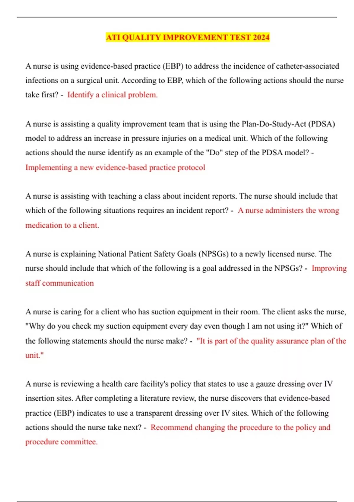 ATI QUALITY IMPROVEMENT TEST 2024 A nurse is using evidence-based practice (EBP) to address the incidence of catheter-associated infections on a surgical unit. According to EBP, which of the following actions should the nurse take first? - Identify a clinical problem. A nurse is assisting a quality improvement team that is using the Plan-Do-Study-Act (PDSA) model to address an increase in pressure injuries on a medical unit. Which of the following actions should the nurse identify as an example of the "Do" step of the PDSA model? - Implementing a new evidence-based practice protocol A nurse is assisting with teaching a class about incident reports. The nurse should include that which of the following situations requires an incident report? - A nurse administers the wrong medication to a client. A nurse is explaining National Patient Safety Goals (NPSGs) to a newly licensed nurse. The nurse should include that which of the following is a goal addressed in the NPSGs? - Improving staff communication A nurse is caring for a client who has suction equipment in their room. The client asks the nurse, "Why do you check my suction equipment every day even though I am not using it?" Which of the following statements should the nurse make? - "It is part of the quality assurance plan of the unit."
