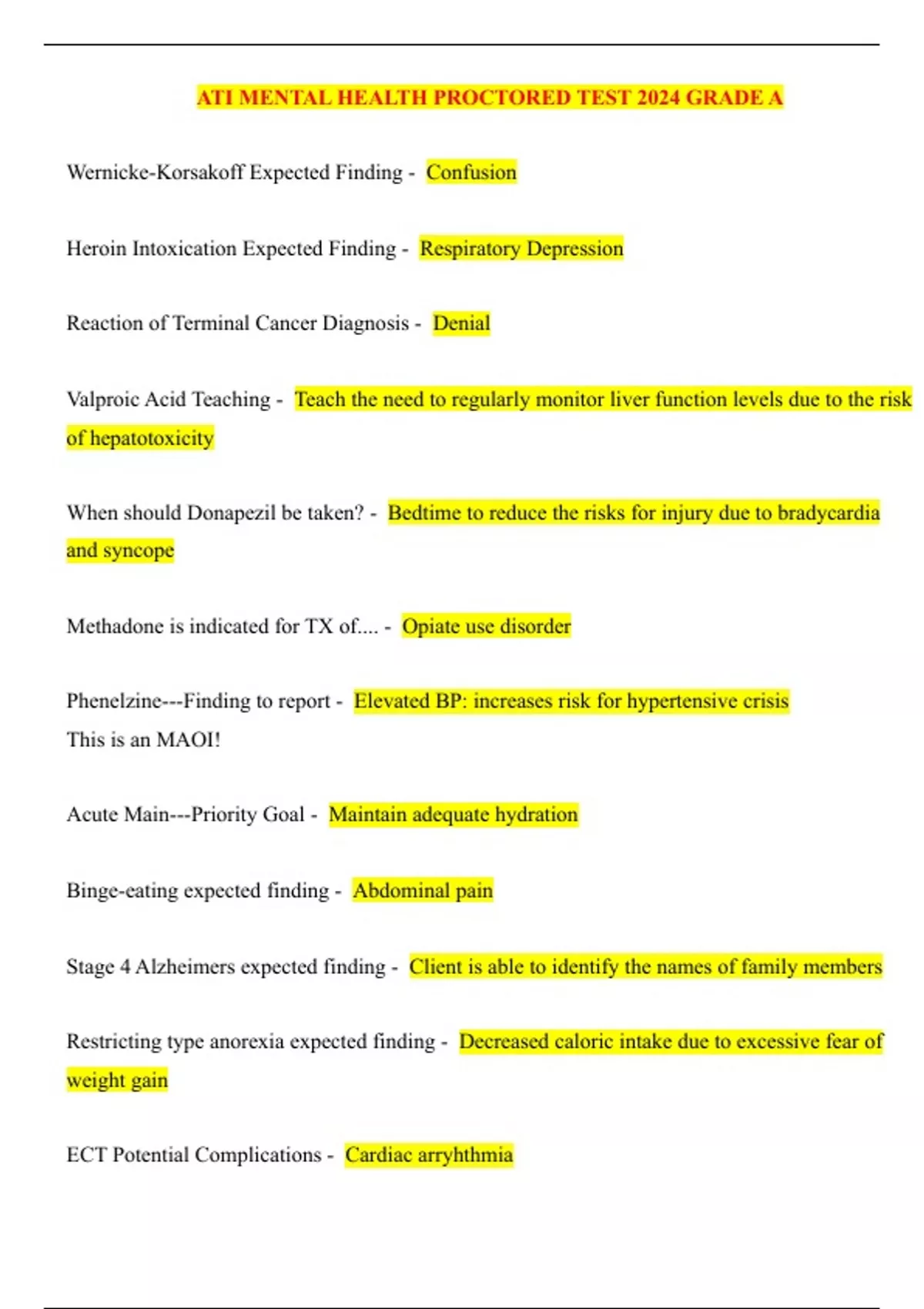 ATI MENTAL HEALTH PROCTORED TEST 2024 GRADE A Wernicke-Korsakoff Expected Finding - Confusion Heroin Intoxication Expected Finding - Respiratory Depression Reaction of Terminal Cancer Diagnosis - Denial Valproic Acid Teaching - Teach the need to regularly monitor liver function levels due to the risk of hepatotoxicity When should Donapezil be taken? - Bedtime to reduce the risks for injury due to bradycardia and syncope Methadone is indicated for TX of.... - Opiate use disorder Phenelzine---Finding to report - Elevated BP: increases risk for hypertensive crisis This is an MAOI! Acute Main---Priority Goal - Maintain adequate hydration Binge-eating expected finding - Abdominal pain Stage 4 Alzheimers expected finding - Client is able to identify the names of family members Restricting type anorexia expected finding - Decreased caloric intake due to excessive fear of weight gain ECT Potential Complications - Cardiac arryhthmia