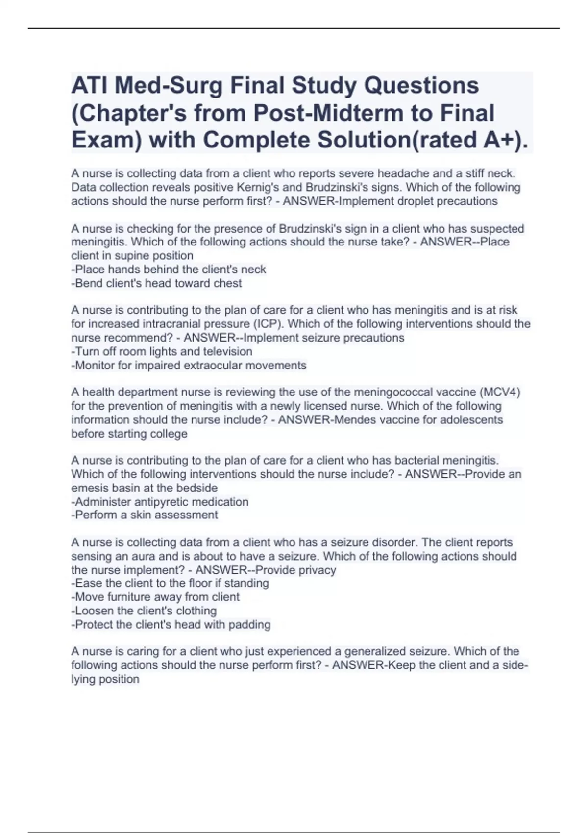 ATI Med-Surg Final Study Questions (Chapter's from Post-Midterm to Final Exam) with Complete Solution(rated A+).A nurse is collecting data from a client who reports severe headache and a stiff neck. Data collection reveals positive Kernig's and Brudzinski's signs. Which of the following actions should the nurse perform first? - ANSWER-Implement droplet precautions A nurse is checking for the presence of Brudzinski's sign in a client who has suspected meningitis. Which of the following actions should the nurse take? - ANSWER--Place client in supine position -Place hands behind the client's neck -Bend client's head toward chest A nurse is contributing to the plan of care for a client who has meningitis and is at risk for increased intracranial pressure (ICP). Which of the following interventions should the nurse recommend? - ANSWER--Implement seizure precautions -Turn off room lights and television -Monitor for impaired extraocular movements A health department nurse is reviewing the use of the meningococcal vaccine (MCV4) for the prevention of meningitis with a newly licensed nurse. Which of the following information should the nurse include? - ANSWER-Mendes vaccine for adolescents before starting college A nurse is contributing to the plan of care for a client who has bacterial meningitis. Which of the following interventions should the nurse include? - ANSWER--Provide an emesis basin at the bedside -Administer antipyretic medication -Perform a skin assessment A nurse is collecting data from a client who has a seizure disorder. The client reports sensing an aura and is about to have a seizure. Which of the following actions should the nurse implement? - ANSWER--Provide privacy -Ease the client to the floor if standing -Move furniture away from client -Loosen the client's clothing -P