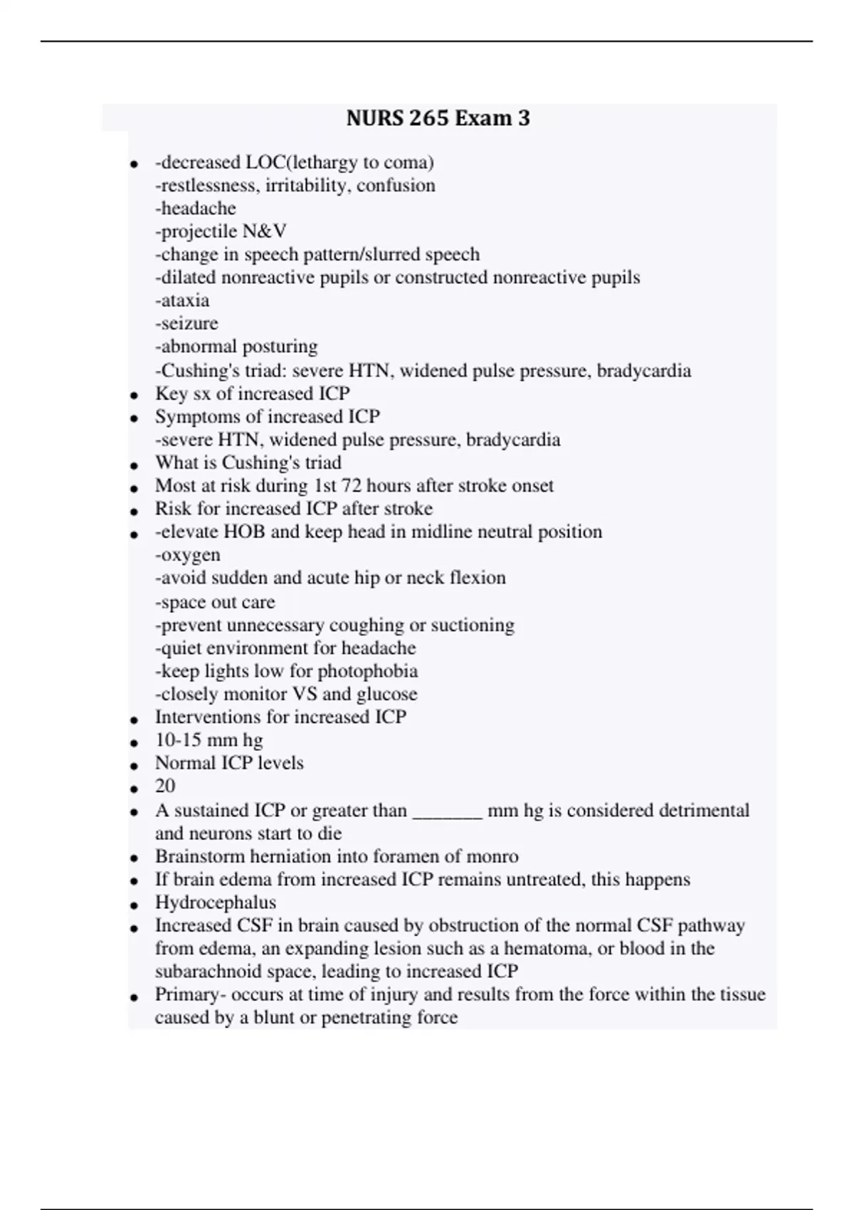 • -decreased LOC(lethargy to coma) -restlessness, irritability, confusion -headache -projectile N&V -change in speech pattern/slurred speech -dilated nonreactive pupils or constructed nonreactive pupils -ataxia -seizure -abnormal posturing -Cushing's triad: severe HTN, widened pulse pressure, bradycardia • Key sx of increased ICP • Symptoms of increased ICP -severe HTN, widened pulse pressure, bradycardia • What is Cushing's triad • Most at risk during 1st 72 hours after stroke onset • Risk for increased ICP after stroke • -elevate HOB and keep head in midline neutral position -oxygen -avoid sudden and acute hip or neck flexion -space out care -prevent unnecessary coughing or suctioning -quiet environment for headache -keep lights low for photophobia -closely monitor VS and glucose • Interventions for increased ICP • 10-15 mm hg • Normal ICP levels • 20 • A sustained ICP or greater than _______ mm hg is considered detrimental and neurons start to die • Brainstorm herniation into foramen of monro • If brain edema from increased ICP remains untreated, this happens • Hydrocephalus • Increased CSF in brain caused by obstruction of the normal CSF pathway from edema, an expanding lesion such as a hematoma, or blood in the subarachnoid space, leading to increased ICP • Primary- occurs at time of injury and results from the force within the tissue caused by a blunt or penetrating forceSecondary- any processes that occur after initial injury and worsen or negatively influence pt outcome • Primary vs secondary brain damage • Focal- confined to specific area of brain and causes localized damage, detected by CT or MRI Diffuse-characterized by damage throughout many areas of brain, not initially detected by CT bc this type is microscopic damage, MRI may detect • Primary brain injury can be a focal or diffuse injury. • Hypotension and hypoxia, intracranial HTN, and cerebral edema • Most common causes of secondary brain injury • epidural hematoma • a collection of blood in the space between the skull and dura mater resulting from arterial bleed • subdural hematoma Can be acute, subacute, or chronic • collection of blood under the dura and above arachnoid mater resulting from venous bleed, bleed is slower than an epidural hematoma • Presents within 48 hr after impact • Acute subdural hematoma • Occurs between 48 hr and 2 weeks after impact • Subacute subdural hematoma • Occurs after 2 weeks to several months after impact. Has highest mortality rate bc it goes unnoticed. • Chronic subdural hematoma • Intracerebral hemorrhage • The accumulation of blood within brain tissue caused by tearing of small arteries and veins in the subcritical white matter • Mild Traumatic Brain Injury (MTBI) • What level of brain injury is Characterized by blow to the head, transient confusion or feeling dazed and disoriented, and one or more of these conditions: loss of consciousness for up to 30 min, loss of memory for events immediately before of after accident, and/or focal neurological deficits that may or may not be transient, no evidence of brain damage on CT • moderate traumatic brain injury • What level of brain injury is Characterized by a period of loss of consciousness for 30 min to 6 hr and a GCS of 9-12. Often(not always) focal or diffuse injury seen on CT. Post trauma amnesia may last up to 24 hours • Severe traumatic brain injury• What level of brain injury is characterized by a GCS score of 3-8, and a loss of consciousness longer than 6 hr. Focal and diffuse damage to brain, brain vessels, and brain ventricles are common • 9-12 • GCS score for moderate traumatic brain injury • 3-8 • GCS score for severe traumatic brain injury • Appears dazed or stunned. Loss of consciousness 30 min. Headache. N&V. Gait problems. Visual problems. Dizzy. Photophobia. Sensitive to noise. Fatigue. Mentally foggy and slowed down. Difficulty concentrating and remembering. Drowsy. Either sleeping more or less than usual. Emotional changes such as irritability, sadness, nervousness, depression, or more emotional. Sx can last days weeks or months(post-concussion syndrome) but usually resolve within 72 hours