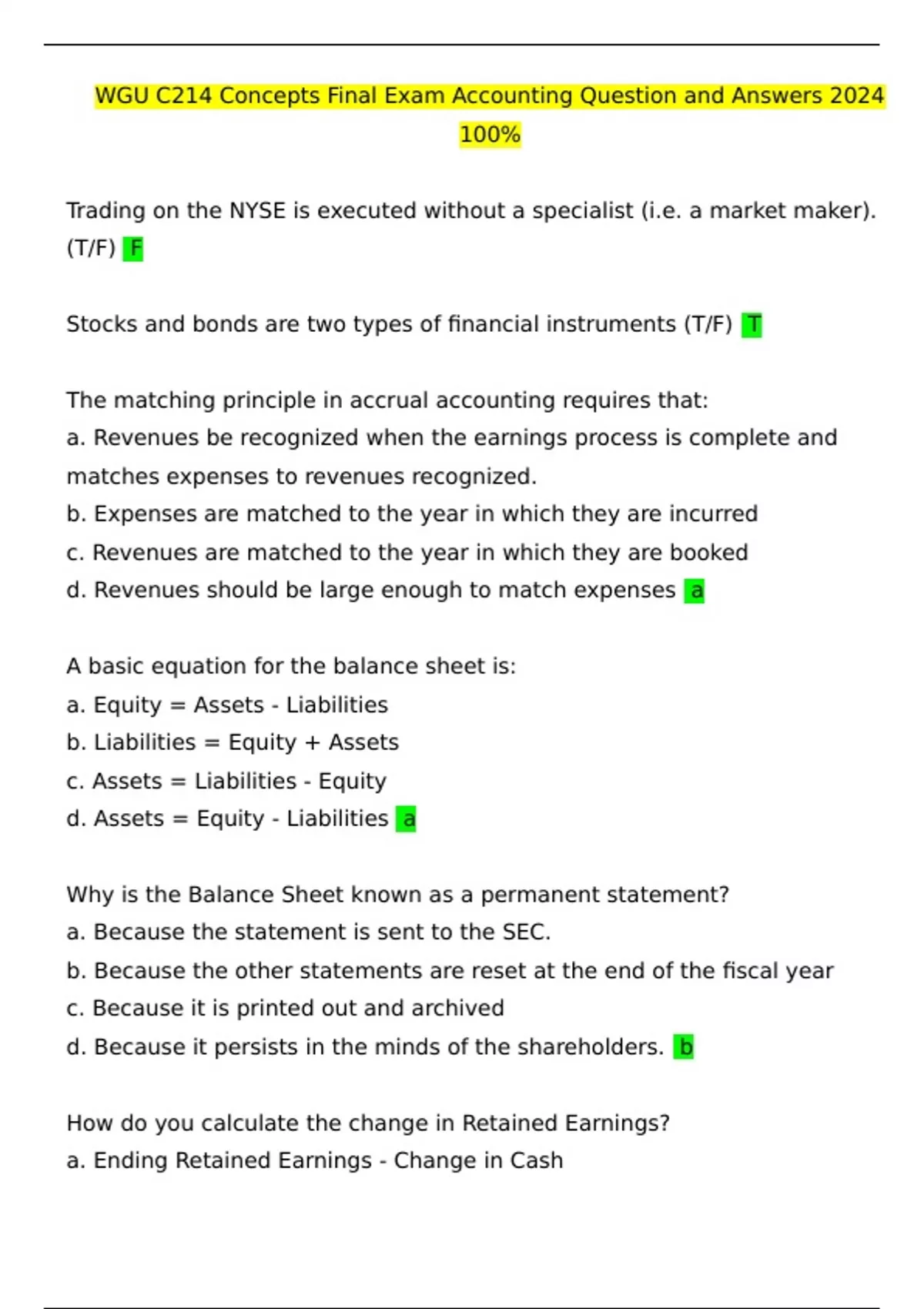 WGU C214 Concepts Final Exam Accounting Question and Answers 2024 100% Trading on the NYSE is executed without a specialist (i.e. a market maker). (T/F) F Stocks and bonds are two types of financial instruments (T/F) T The matching principle in accrual accounting requires that: a. Revenues be recognized when the earnings process is complete and matches expenses to revenues recognized. b. Expenses are matched to the year in which they are incurred c. Revenues are matched to the year in which they are booked d. Revenues should be large enough to match expenses a A basic equation for the balance sheet is: a. Equity = Assets - Liabilities b. Liabilities = Equity + Assets c. Assets = Liabilities - Equity d. Assets = Equity - Liabilities a Why is the Balance Sheet known as a permanent statement? a. Because the statement is sent to the SEC. b. Because the other statements are reset at the end of the fiscal year c. Because it is printed out and archived d. Because it persists in the minds of the shareholders. b How do you calculate the change in Retained Earnings? a. Ending Retained Earnings - Change in Cash b. EBIT divided by Total Assets + Dividends c. EBIT - Change in Cash - Dividends d. Net Income - Dividends d Which of the following is generally true? a. Gross Profit and Operating Income are the same b. Cost of Goods Sold + Operating Expenses = Net Income c. Operating Income and EBIT are the same d. EBIT + Income Taxes = Net income c Which components are part of total assets? a. Cash, Accounts Receivable, Short Term Debt b. Cash Accounts Receivable, Inventory, Long Term Assets c. Accounts Payable, Long Term Assets, Long Term Debt d. Accounts Payable, Net Income, Equity b