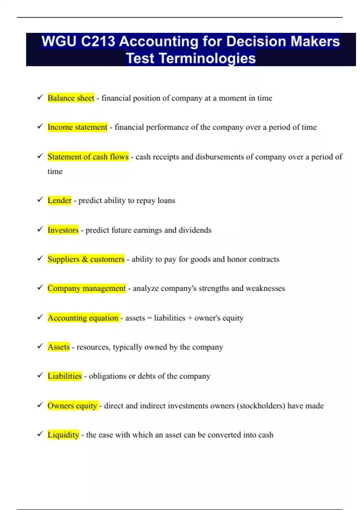 WGU C213 Accounting for Decision Makers Test Terminologies Balance sheet - financial position of company at a moment in time Income statement - financial performance of the company over a period of time Statement of cash flows - cash receipts and disbursements of company over a period of time Lender - predict ability to repay loans Investors - predict future earnings and dividends Suppliers & customers - ability to pay for goods and honor contracts Company management - analyze company's strengths and weaknesses Accounting equation - assets = liabilities + owner's equity Assets - resources, typically owned by the company Liabilities - obligations or debts of the company Owners equity - direct and indirect investments owners (stockholders) have made Liquidity - the ease with which an asset can be converted into cash Current assets - cash and other assets expected to be exchanged for cash or consumed within a year Accounts receivable - amounts owed by customers as a result of credit sales, usually collected in cash within 60 days of the sale. Short-term investments - investments in stocks or bonds of another company that the company plans to sell within 12 monts Long term assets - assets the company does not expect to convert to cash or consume within 12 months Long-term investments - investments in stock or bonds of another company that the company does not plan to sell within 12 months Property, plant, and equipment (pp&e) - land, buildings, machinery, and tools. Intangible assets - assets that have to physical or tangible characteristics (patents, copyrights, and trademarks)