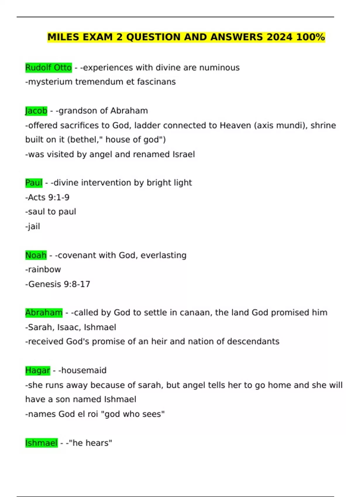 MILES EXAM 2 QUESTION AND ANSWERS 2024 100% Rudolf Otto - -experiences with divine are numinous -mysterium tremendum et fascinans Jacob - -grandson of Abraham -offered sacrifices to God, ladder connected to Heaven (axis mundi), shrine built on it (bethel," house of god") -was visited by angel and renamed Israel Paul - -divine intervention by bright light -Acts 9:1-9 -saul to paul -jail Noah - -covenant with God, everlasting -rainbow -Genesis 9:8-17 Abraham - -called by God to settle in canaan, the land God promised him -Sarah, Isaac, Ishmael -received God's promise of an heir and nation of descendants Hagar - -housemaid -she runs away because of sarah, but angel tells her to go home and she will have a son named Ishmael -names God el roi "god who sees" Ishmael - -"he hears" -abrahams first son -father of Arab nation El Roi - -name given by Hagar to God -"God who sees" Mary - -angel Gabriel comes to her -Immanuel "God who saves" -Luke 1:26-38 Gabriel - -angel Mithras - -god of light Beth-el - -house of God -named by Jacob Mecca - -holiest city in Islam -Muhammad's birthplace 620 CE - -the night of ascent before migration to Mecca December 25 - -birth date of Mithras -birth of Jesus experiential - -individual experience with divine numinous - -spirit -any experience with divine mysterium tremendum et fascinans - -twin emotions -fear and amazement navel of the world - -every culture thinks they were center of created order -first map ever with Babylonia