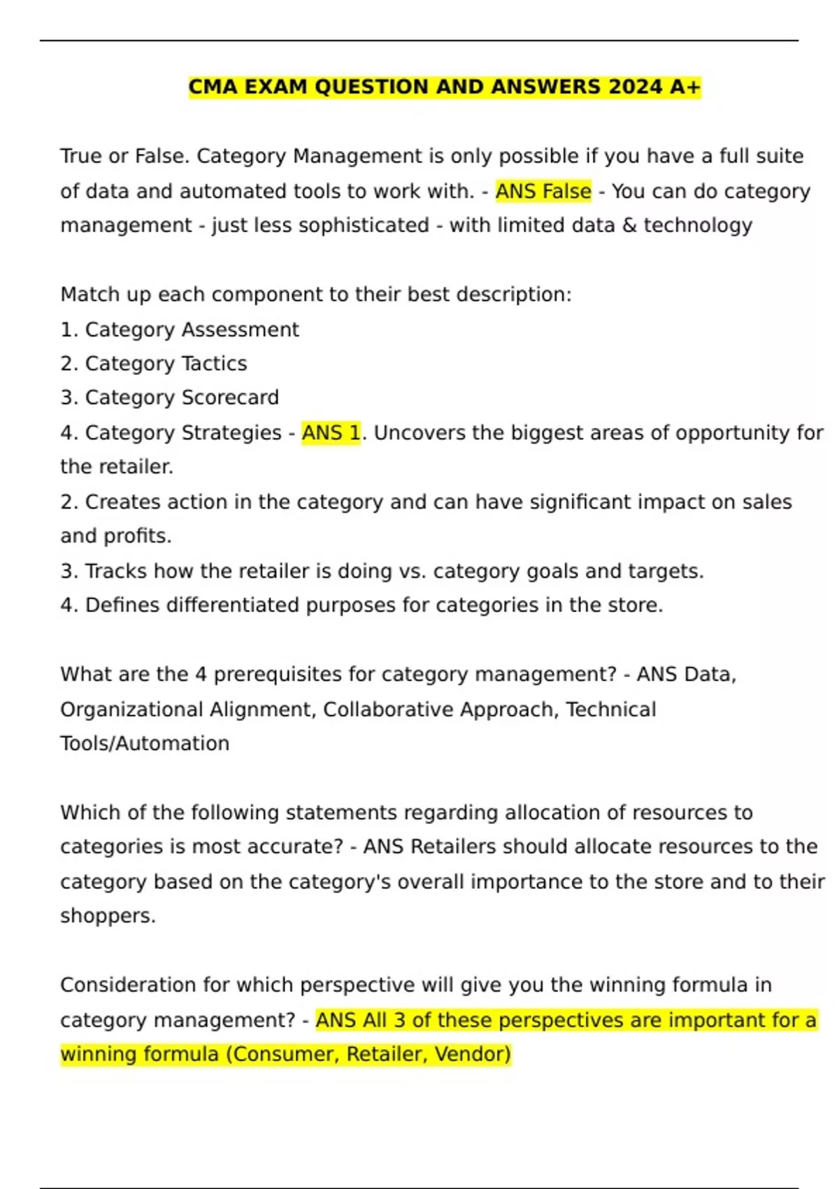 CMA EXAM QUESTION AND ANSWERS 2024 A+ True or False. Category Management is only possible if you have a full suite of data and automated tools to work with. - ANS False - You can do category management - just less sophisticated - with limited data & technology Match up each component to their best description: 1. Category Assessment 2. Category Tactics 3. Category Scorecard 4. Category Strategies - ANS 1. Uncovers the biggest areas of opportunity for the retailer. 2. Creates action in the category and can have significant impact on sales and profits. 3. Tracks how the retailer is doing vs. category goals and targets. 4. Defines differentiated purposes for categories in the store. What are the 4 prerequisites for category management? - ANS Data, Organizational Alignment, Collaborative Approach, Technical Tools/Automation Which of the following statements regarding allocation of resources to categories is most accurate? - ANS Retailers should allocate resources to the category based on the category's overall importance to the store and to their shoppers. Consideration for which perspective will give you the winning formula in category management? - ANS All 3 of these perspectives are important for a winning formula (Consumer, Retailer, Vendor) There are several roles that retails may ask their vendors to participate in. _________ or Vendor Advisors may be responsible for providing labor assistance and helping them grow the category for the retailer. _________ or Validators refer to vendors that a retailer selects to provide supplemental data, resources, analytics, ideas, (and often a second opinion). This results in a team capable of producing enough business analysis and tactical programs to make the category management process succeed for the retailer. - ANS Category Captains, Category Advisors Which of the following answers presents the original category management 8-step process defined by the joint industry in the correct sequence? - ANS 1. Category Definition 2. Category Role 3. Category Assessment 4. Category Scorecard 5. Category Strategies 6. Category Tactics 7. Plan Implementation 8. Category Review