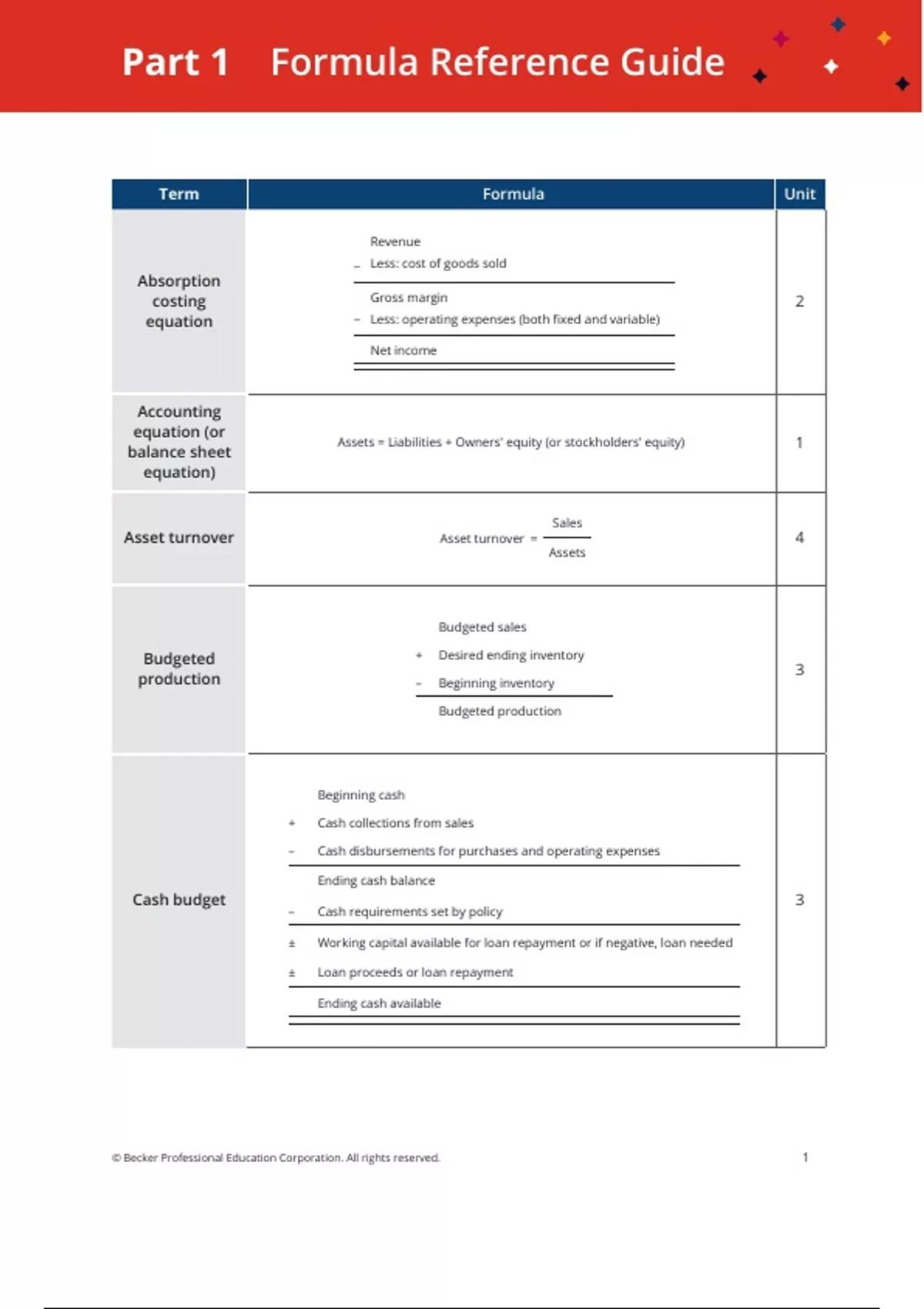 Part 1 Formula Reference Guide Term Formula Unit Absorption costing equation − Revenue Less: cost of goods sold − Gross margin Less: operating expenses (both fixed and variable) Net income 2 Accounting equation (or balance sheet equation) Assets = Liabilities + Owners' equity (or stockholders' equity) 1 Asset turnover Asset turnover = Sales Assets 4 Budgeted production Budgeted sales + Desired ending inventory – Beginning inventory Budgeted production 3 Cash budget Beginning cash + Cash collections from sales – Cash disbursements for purchases and operating expenses Ending cash balance – Cash requirements set by policy ± Working capital available for loan repayment or if negative, loan needed