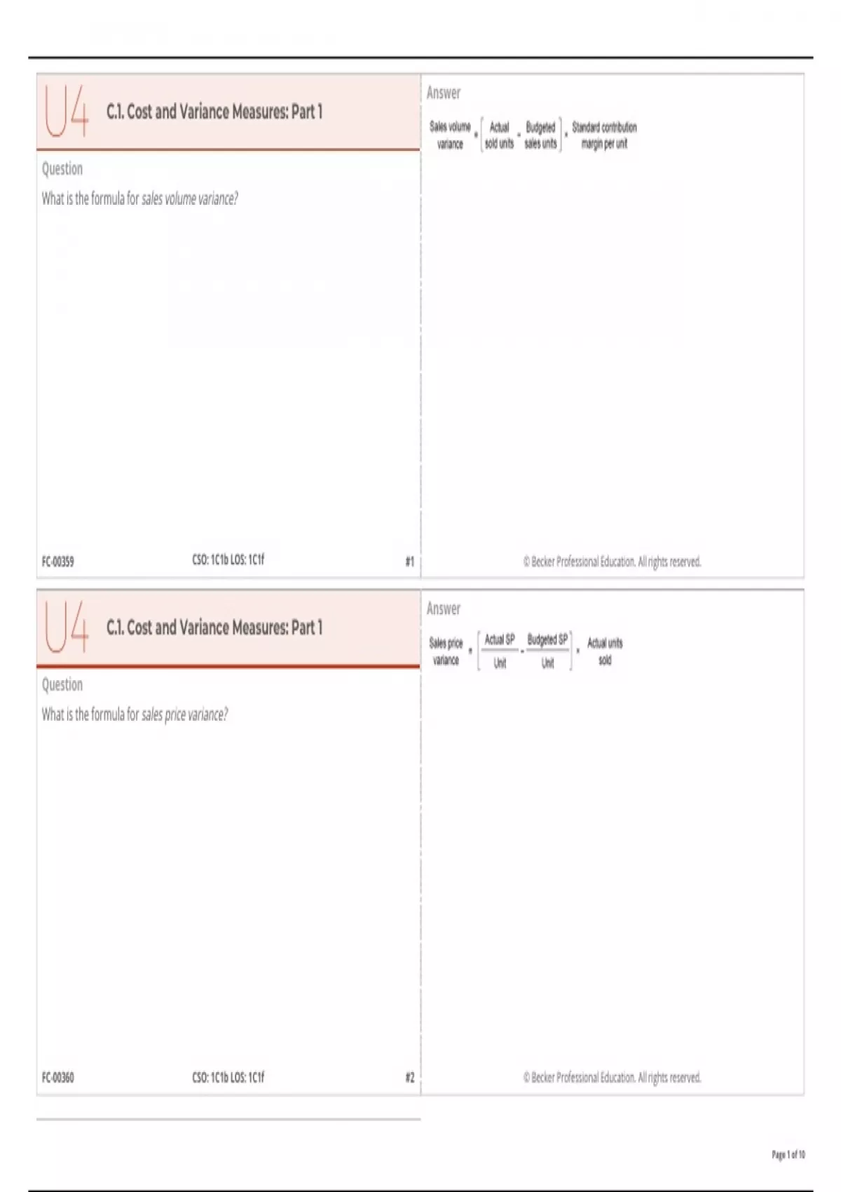 U4 C.1. Cost and Variance Measures: Part 1 Question What is the formula for sales volume variance? Answer U4 C.1. Cost and Variance Measures: Part 1 Question What is the formula for sales price variance? Answer U4 Page 2 of 10 FC-00353 CSO: 1C1e LOS: 1C1k #4 FC-00352 CSO: 1C1e LOS: 1C1k #3 1. 2. 1. 2. U4 C.1. Cost and Variance Measures: Part 2 Question Identify the direct materials variances (two-way variance analysis). Answer Direct materials price variance = (AP − SP) × AQ where: AP = actual price SP = standard price AQ = actual quantity purchased Direct materials quantity usage variance = (AQ − SQ) × SP where: AQ = actual quantity used SQ = standard quantity allowed SP = standard price U4 C.1. Cost and Variance Measures: Part 2 Question Identify the direct labor variances (two-way variance analysis). Answer Direct labor rate variance = (AR – SR) × AH Direct labor efficiency variance = (AH – SH) × SR where: AR = actual labor rate SR = standard labor rate AH = actual hours worked SH = standard hours allowed