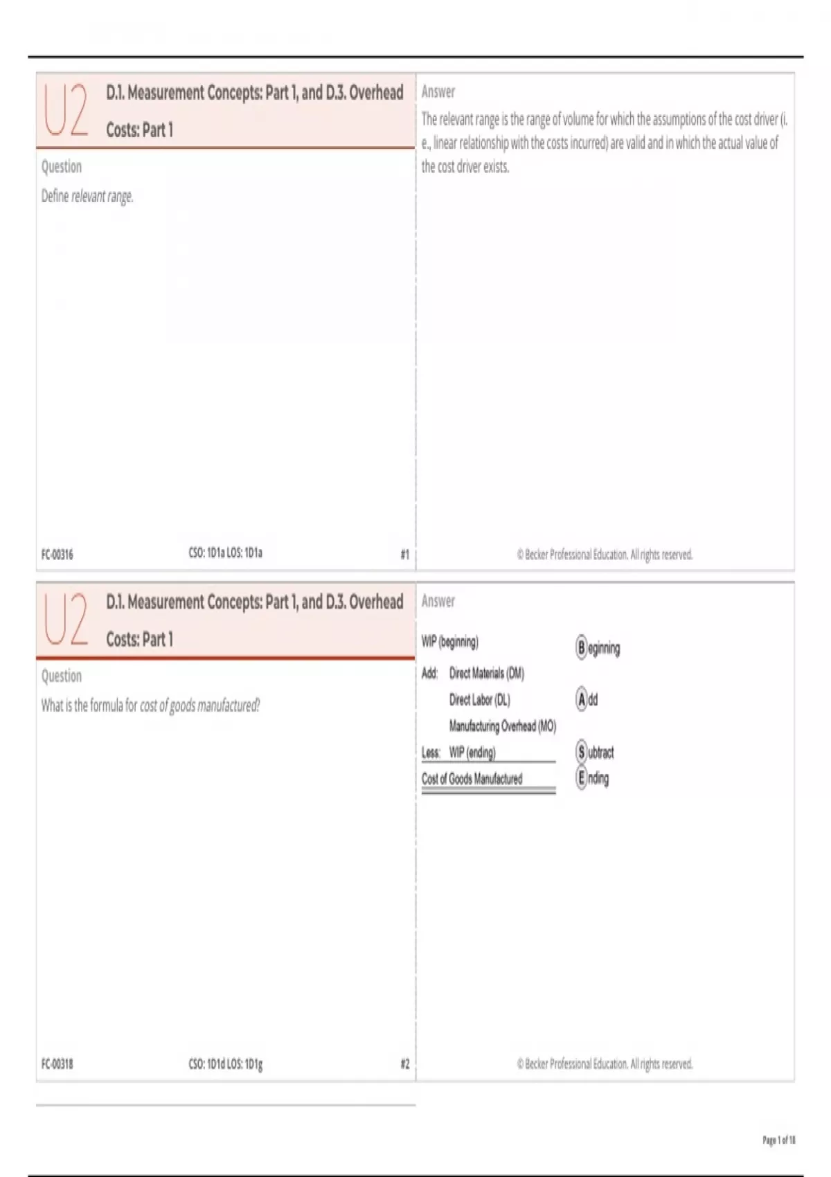 U2 D.1. Measurement Concepts: Part 1, and D.3. Overhead Costs: Part 1 Question Define relevant range. Answer The relevant range is the range of volume for which the assumptions of the cost driver (i. e., linear relationship with the costs incurred) are valid and in which the actual value of the cost driver exists. U2 D.1. Measurement Concepts: Part 1, and D.3. Overhead Costs: Part 1 Question Explain the difference between the contribution approach and the absorption approach. Answer The difference is the treatment of fixed overhead. Under the absorption approach, fixed overhead is a product cost. Under the contribution approach, fixed overhead is a period cost.