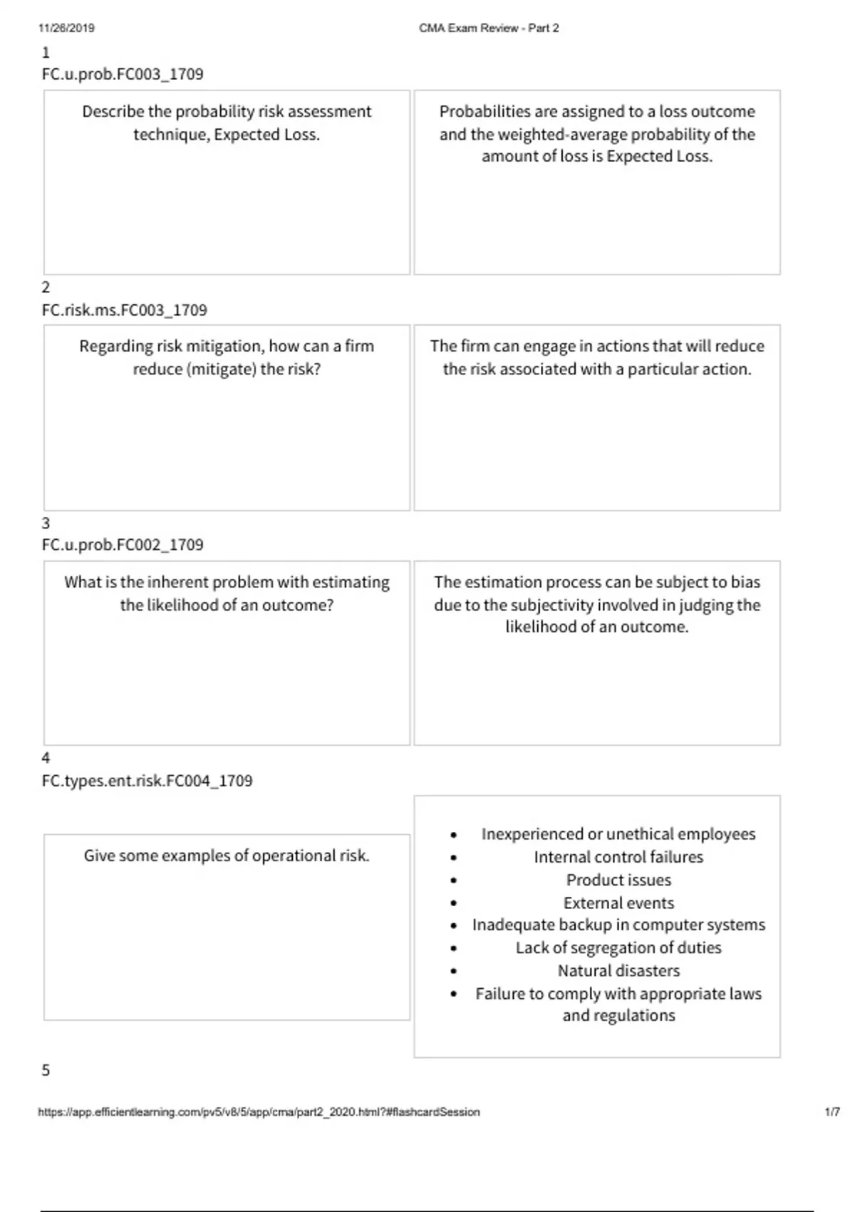 Describe the probability risk assessment technique, Expected Loss. Probabilities are assigned to a loss outcome and the weighted-average probability of the amount of loss is Expected Loss. 2 FC..FC003_1709 Regarding risk mitigation, how can a firm reduce (mitigate) the risk? The firm can engage in actions that will reduce the risk associated with a particular action. 3 FC..FC002_1709 What is the inherent problem with estimating the likelihood of an outcome? The estimation process can be subject to bias due to the subjectivity involved in judging the likelihood of an outcome. 4 FC..FC004_1709 Give some examples of operational risk. Inexperienced or unethical employees Internal control failures Product issues External events Inadequate backup in computer systems Lack of segregation of duties Natural disasters Failure to comply with appropriate laws and regulations