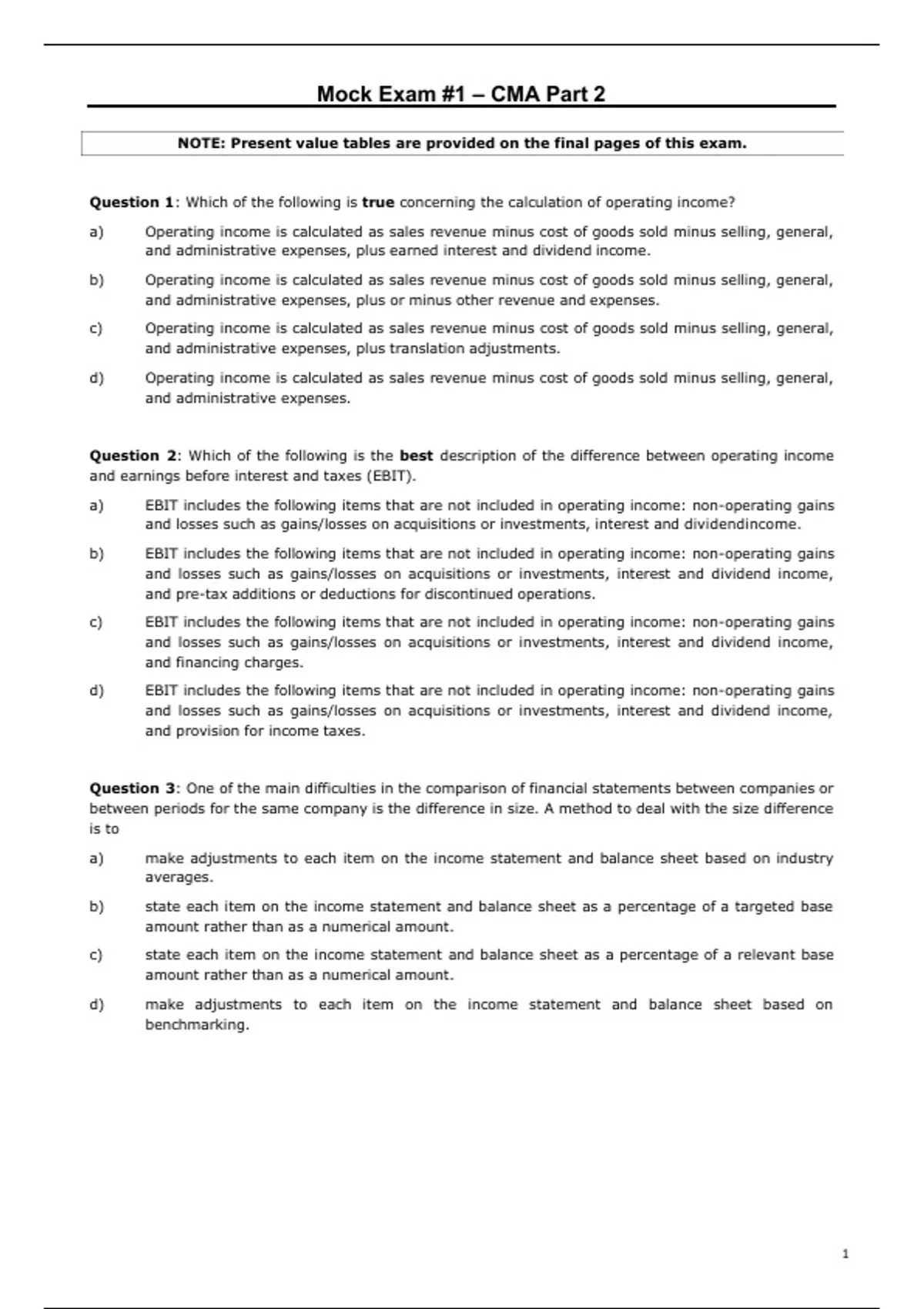 Mock Exam #1 – CMA Part 2 NOTE: Present value tables are provided on the final pages of this exam. Question 1: Which of the following is true concerning the calculation of operating income? a) b) c) d) Operating income is calculated as sales revenue minus cost of goods sold minus selling, general, and administrative expenses, plus earned interest and dividend income. Operating income is calculated as sales revenue minus cost of goods sold minus selling, general, and administrative expenses, plus or minus other revenue and expenses. Operating income is calculated as sales revenue minus cost of goods sold minus selling, general, and administrative expenses, plus translation adjustments. Operating income is calculated as sales revenue minus cost of goods sold minus selling, general, and administrative expenses. Question 2: Which of the following is the best description of the difference between operating income and earnings before interest and taxes (EBIT). a) b) EBIT includes the following items that are not included in operating income: non-operating gains and losses such as gains/losses on acquisitions or investments, interest and dividendincome. EBIT includes the following items that are not included in operating income: non-operating gains and losses such as gains/losses on acquisitions or investments, interest and dividend income, and pre-tax additions or deductions for discontinued operations. c) EBIT includes the following items that are not included in operating income: non-operating gains and losses such as gains/losses on acquisitions or investments, interest and dividend income, and financing charges. d) EBIT includes the following items that are not included in operating income: non-operating gains and losses such as gains/losses on acquisitions or investments, interest and dividend income, and provision for income taxes. Question 3: One of the main difficulties in the comparison of financial statements between companies or between periods for the same company is the difference in size. A method to deal with the size difference is to a) b) c) d) make adjustments to each item on the income statement and balance sheet based on industry averages. state each item on the income statement and balance sheet as a percentage of a targeted base amount rather than as a numerical amount. state each item on the income statement and balance sheet as a percentage of a relevant base amount rather than as a numerical amount. make adjustments to each item on the income statement and balance sheet based on benchmarking. 1 Mock Exam #1 – CMA Part 2 Question 4: Gamma-Ray Corporation’s summarized common-size income statements for its 20X5 actual results and 20X6 planned results are shown below: 20X5 Actual 100% 50% 40% 10% 20X6 Planned 100% 50% ? Sales COGS Selling & Admin Operating income ? Gamma-Ray believes that units sold will increase 5% in 20X6; however, there will be no price increase to its customers and no anticipated cost increase from its vendors. Selling and administrative expenses are anticipated to be 5% variable and 95% fixed. If all predictions materialize, Gamma-Ray should expect operating income in 20X6 to a) b) c) d) be greater than 13% but less than 14% of sales. be greater than 14% of sales. be less than 11% of sales. be greater than 11% but less than 13% of sales. Question 5: A management accountant has been asked to provide earnings forecasts for the next three years. In order to complete this assignment, the management accountant would be least likely to a) b) use common-size financial statements to estimate expenses as a percentage of net income. examine the variability of the predicted outcomes by performing sensitivity and scenario analysis. c) assume that the key financial ratios will remain unchanged for the forecasted period. discuss the key assumptions with senior management.